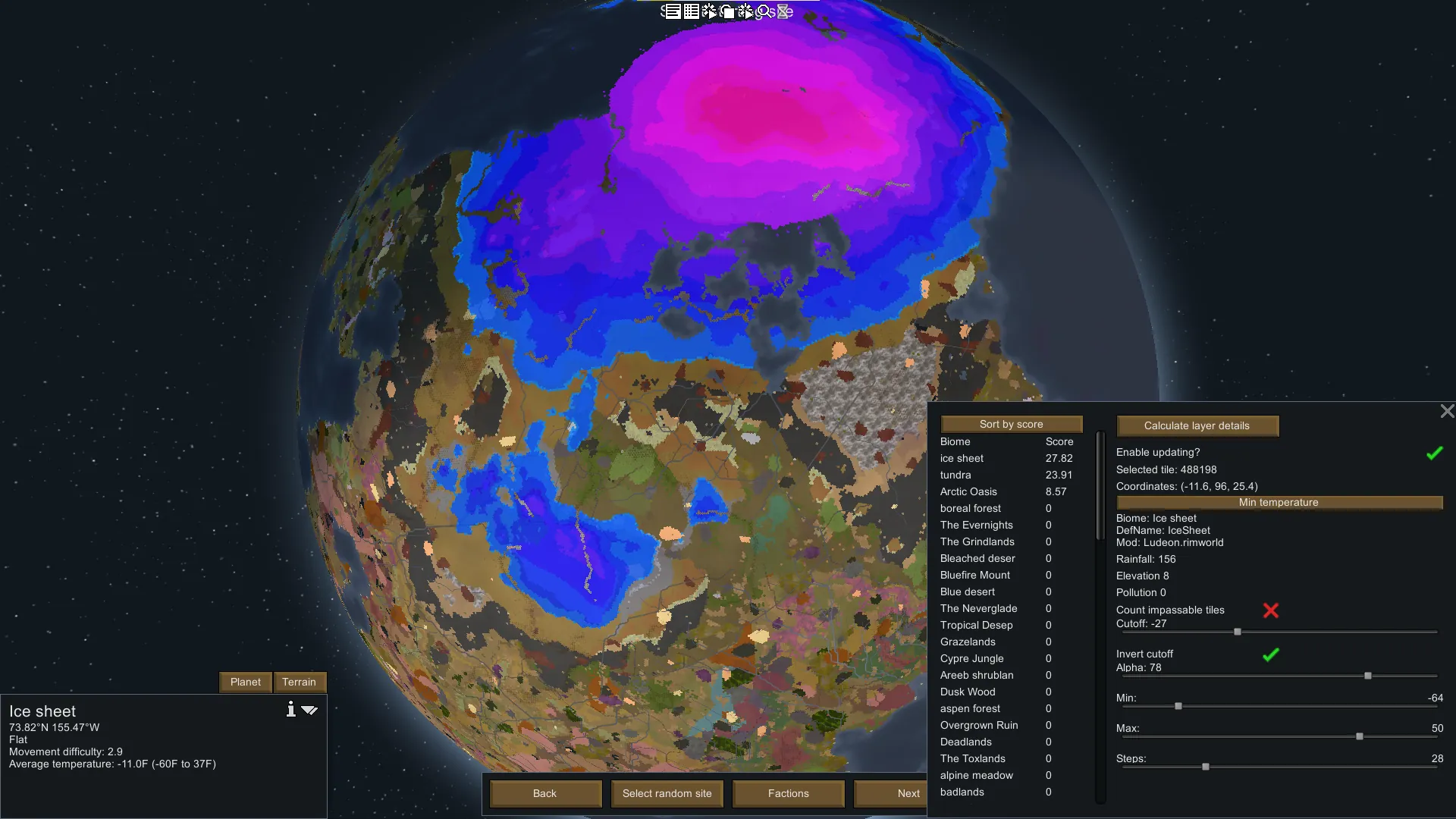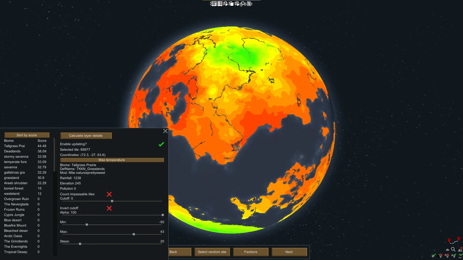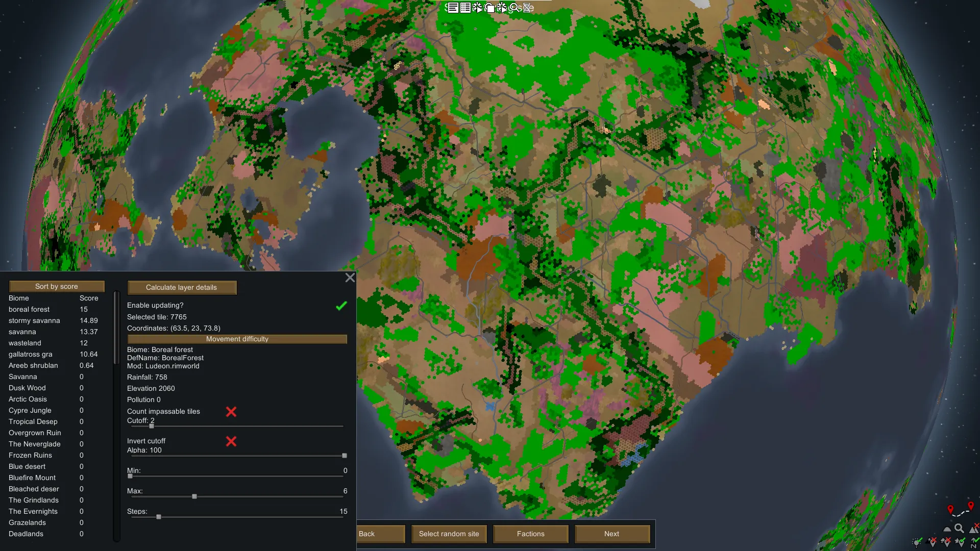 [*] Multiple filters including the ability to filter by temperature, elevation, rainfall, biome score, and movement difficulty.