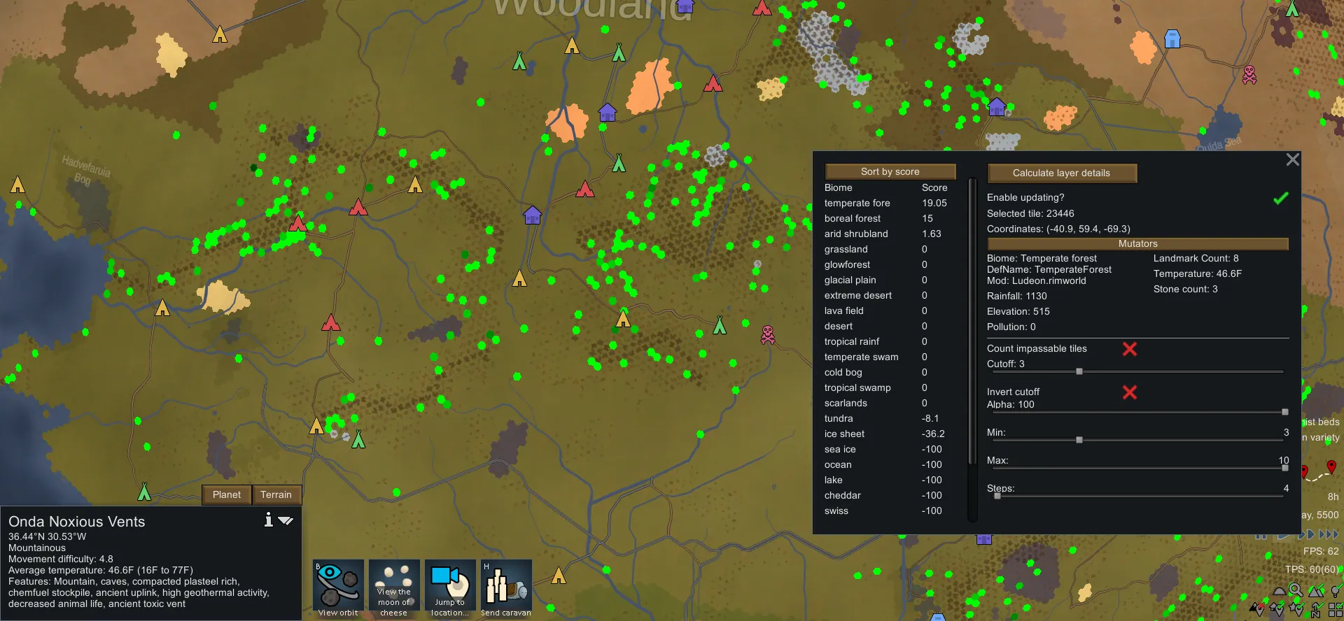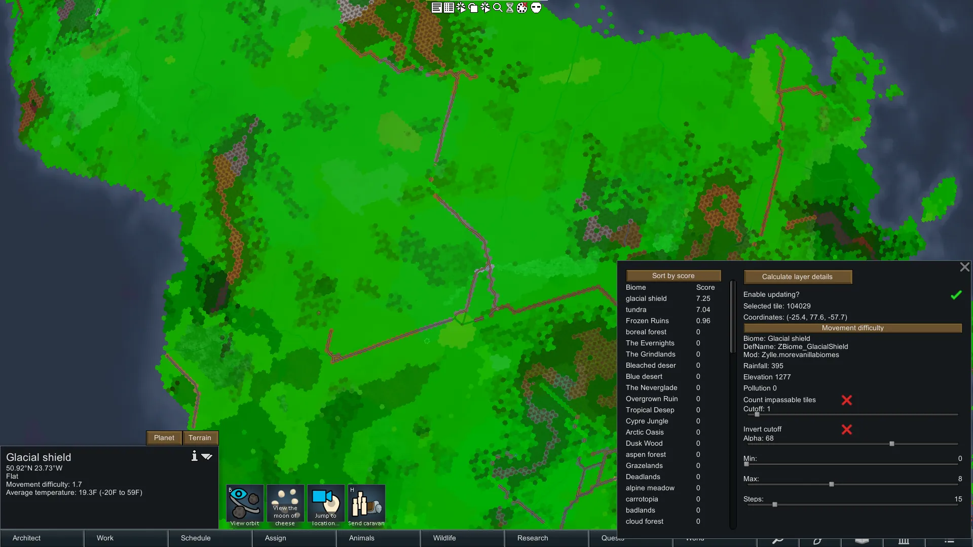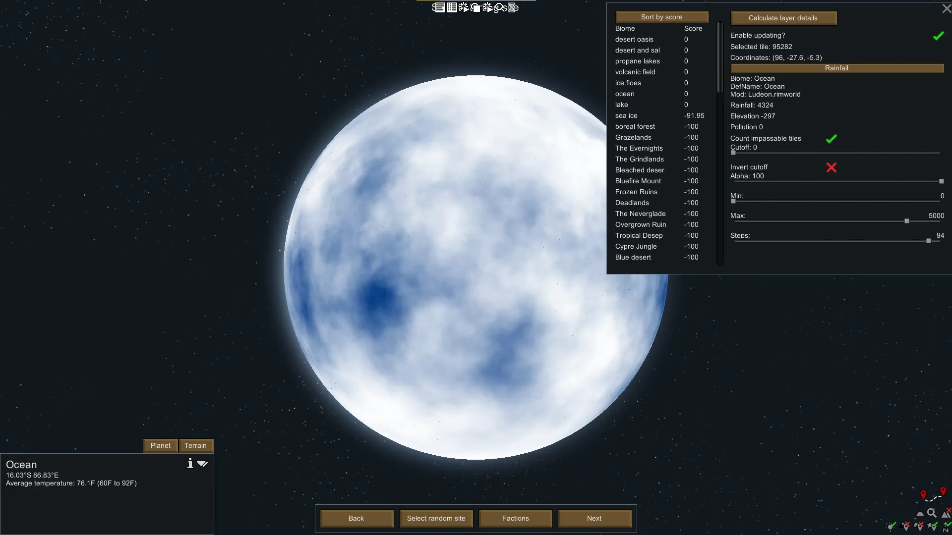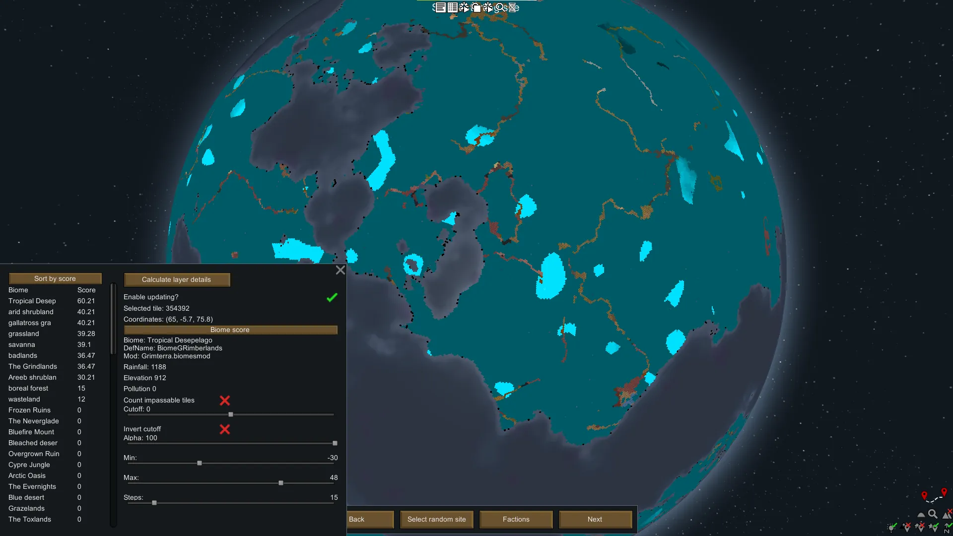 [*] Multiple filters including the ability to filter by temperature, elevation, rainfall, biome score, and movement difficulty.
