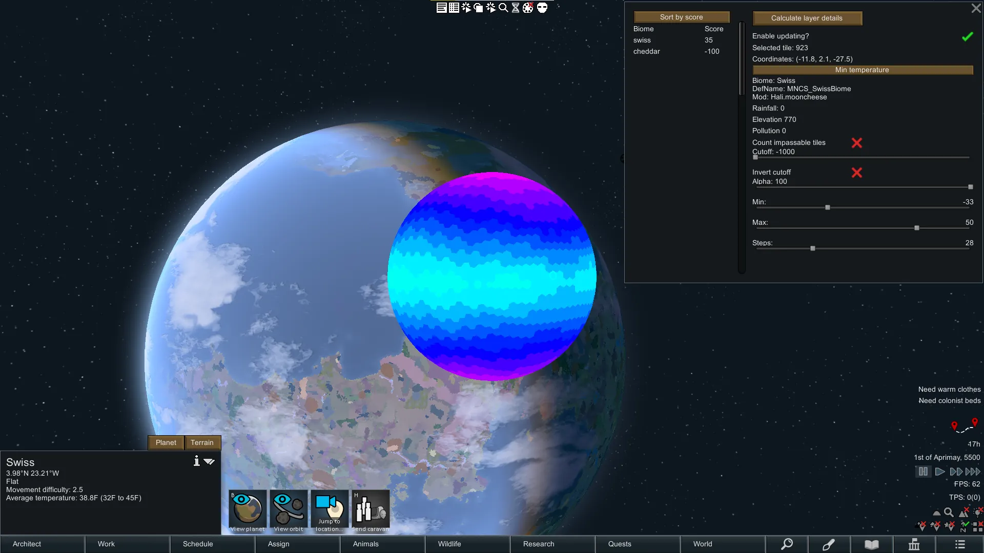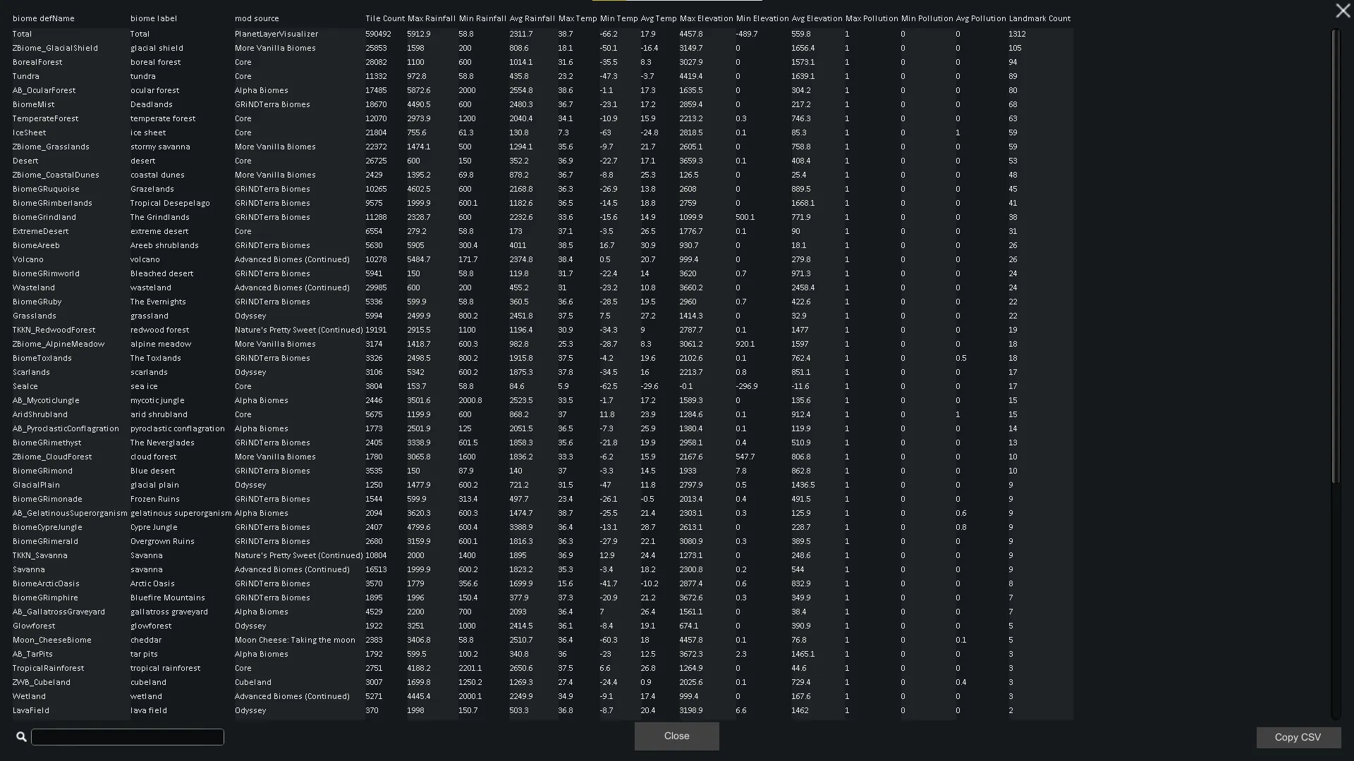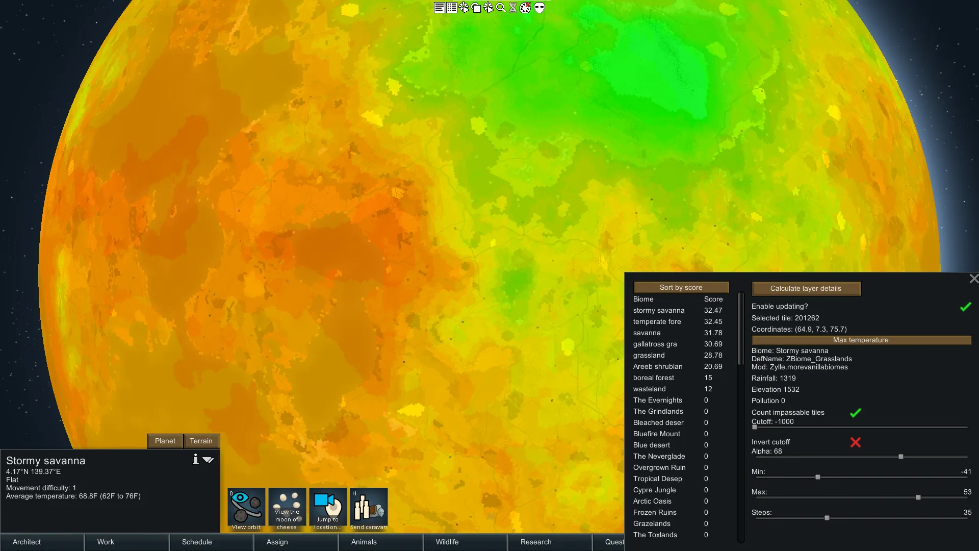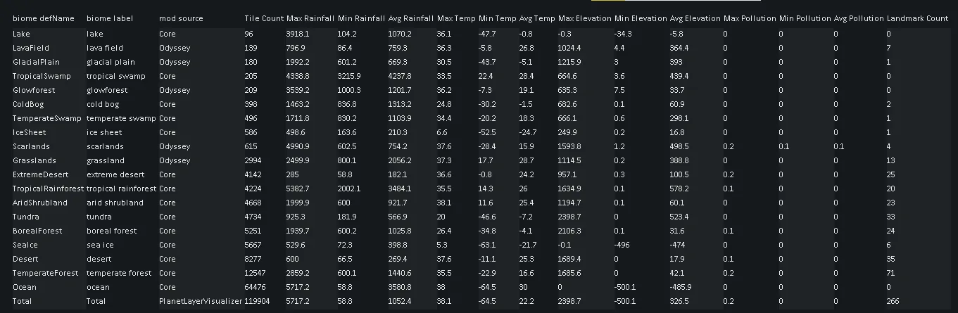 Planet layer visualizer is a mod I created mainly for development purposes. It allows you to quickly and easily see the stats of a planet layer displayed visually for the world.