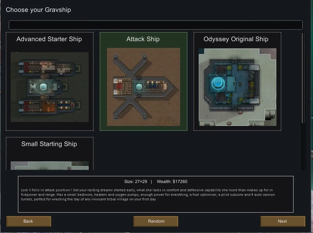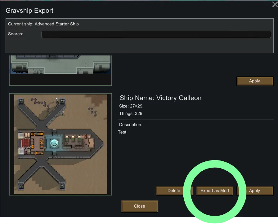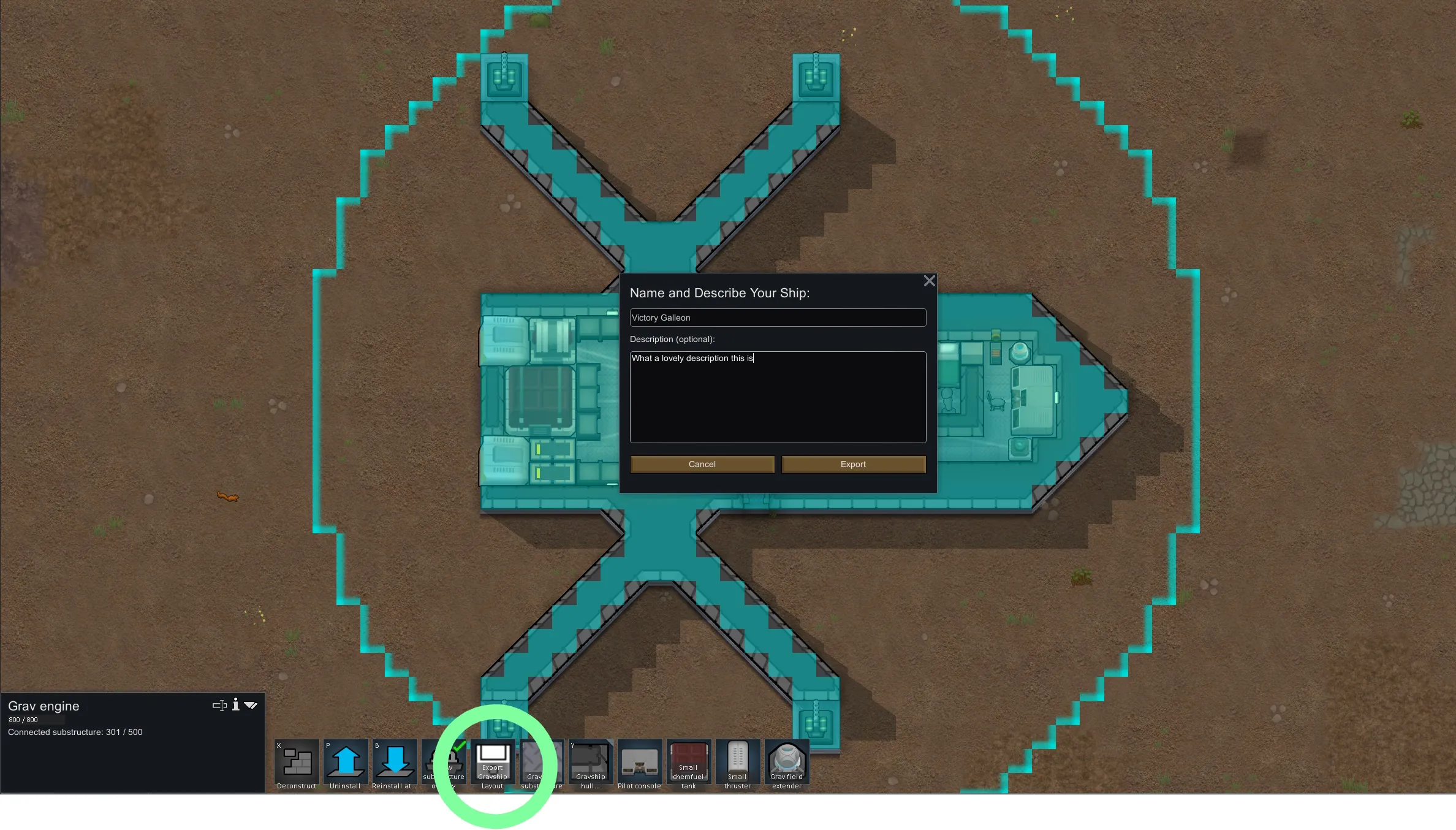 [*] Export your Gravship direct from in game, includes all buildings and attached things, but not Pawns or Items ([b][u]HINT[/u][/b] Make sure you have some Shelves on ships you export (might even need some Vanilla ones) otherwise your starting items might not spawn !