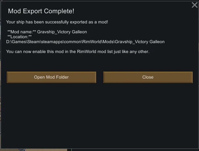 [*] Take a ship you've exported and export it further to be it's own mod ! The exporter builds your About.xml and if there's already a preview image for your ship will copy it into the right place with the right name for you, You can then publish that to the steam workshop yourself to share with others :)