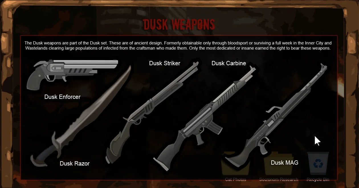 - Dusk Weapons and other Elite Dead Frontier gear such as the ancient Vengeance Guard!