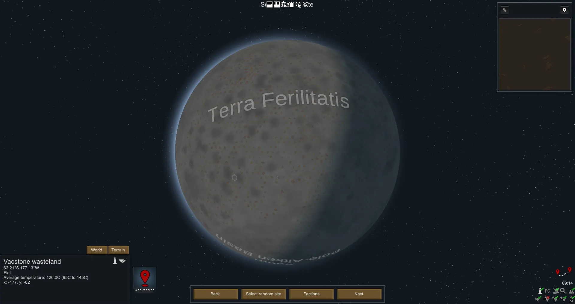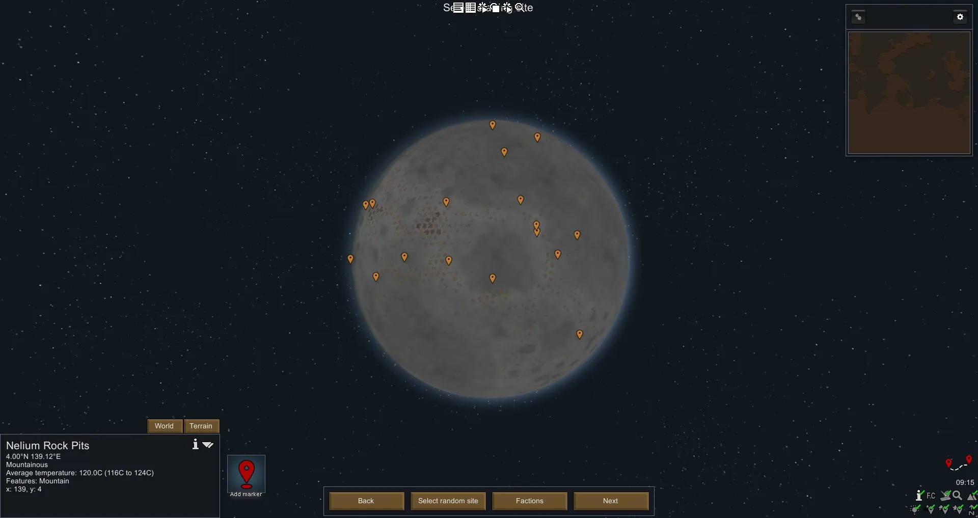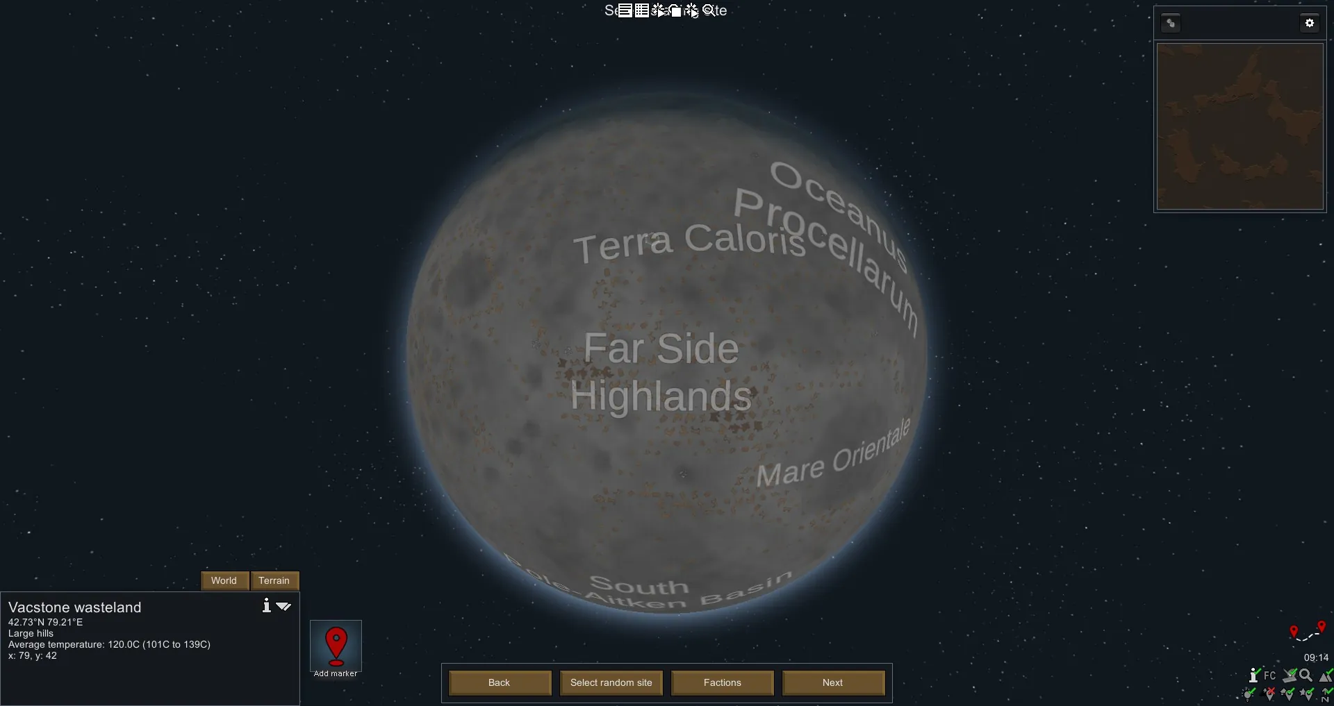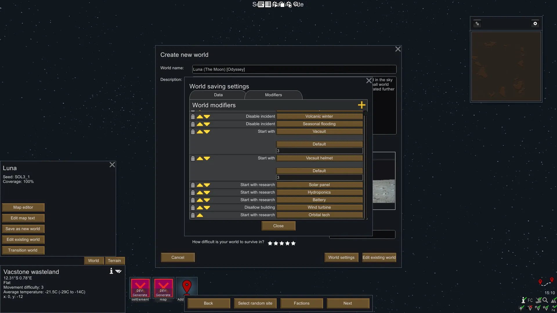 Play on the moon! Start with Vacsuits and helmet. Start with research: Batteries, Solar panels, hydroponics and orbital tech. Includes a version with and without factions.