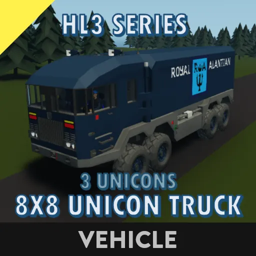The HL3 series of 8x8 truck is the primary heavy duty cargo truck of the Royal Alantian Shipping Company. its rugged design and excellent fuel efficiency make it the perfect vehicle for long haul heavy transport duties over rough terrain. this variant in the HL3 series is outfitted to carry 3 unicons. it also comes with a sleeping cab as standard
