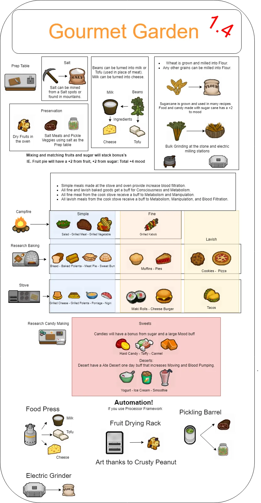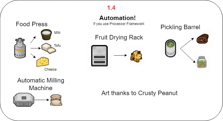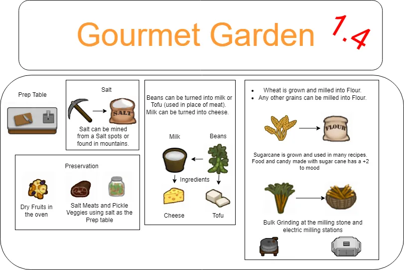 Garden Gourmet adds a bunch of new worktables, recipes, food based joy items, and meal items into the game. Along with new ways to preserve them.
