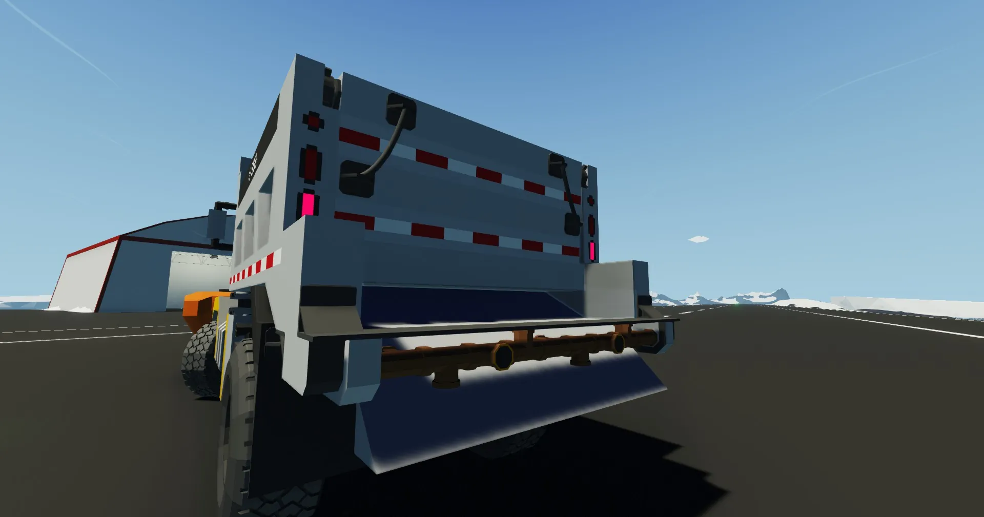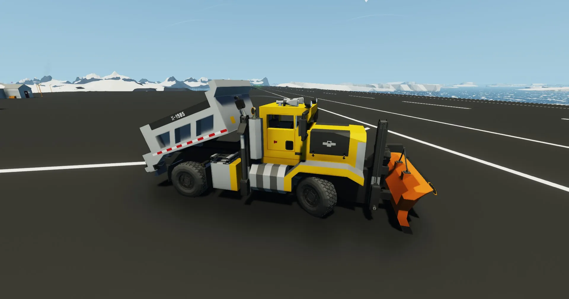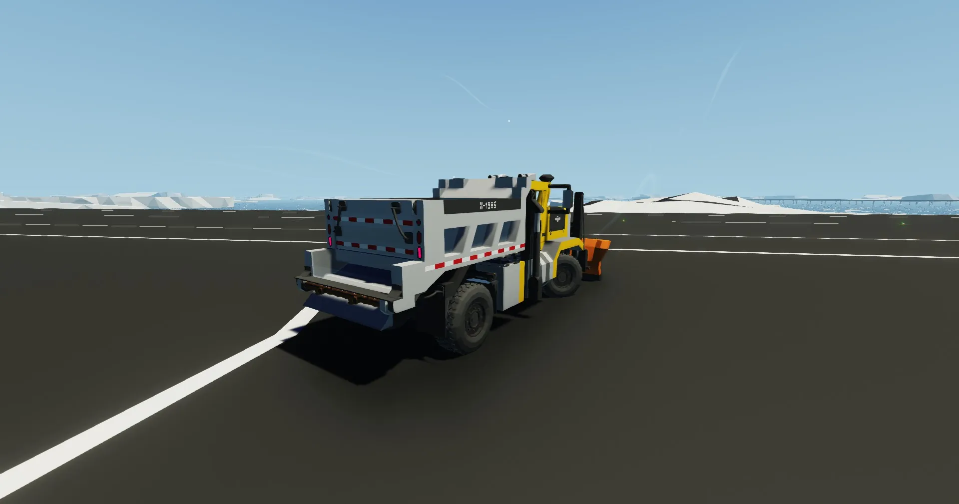 This loose replica of the trucks used by the Maryland State Highway Administration features an OshKosh P series chassis, blade controls, a dumping bed, and a full suite of lighting systems.