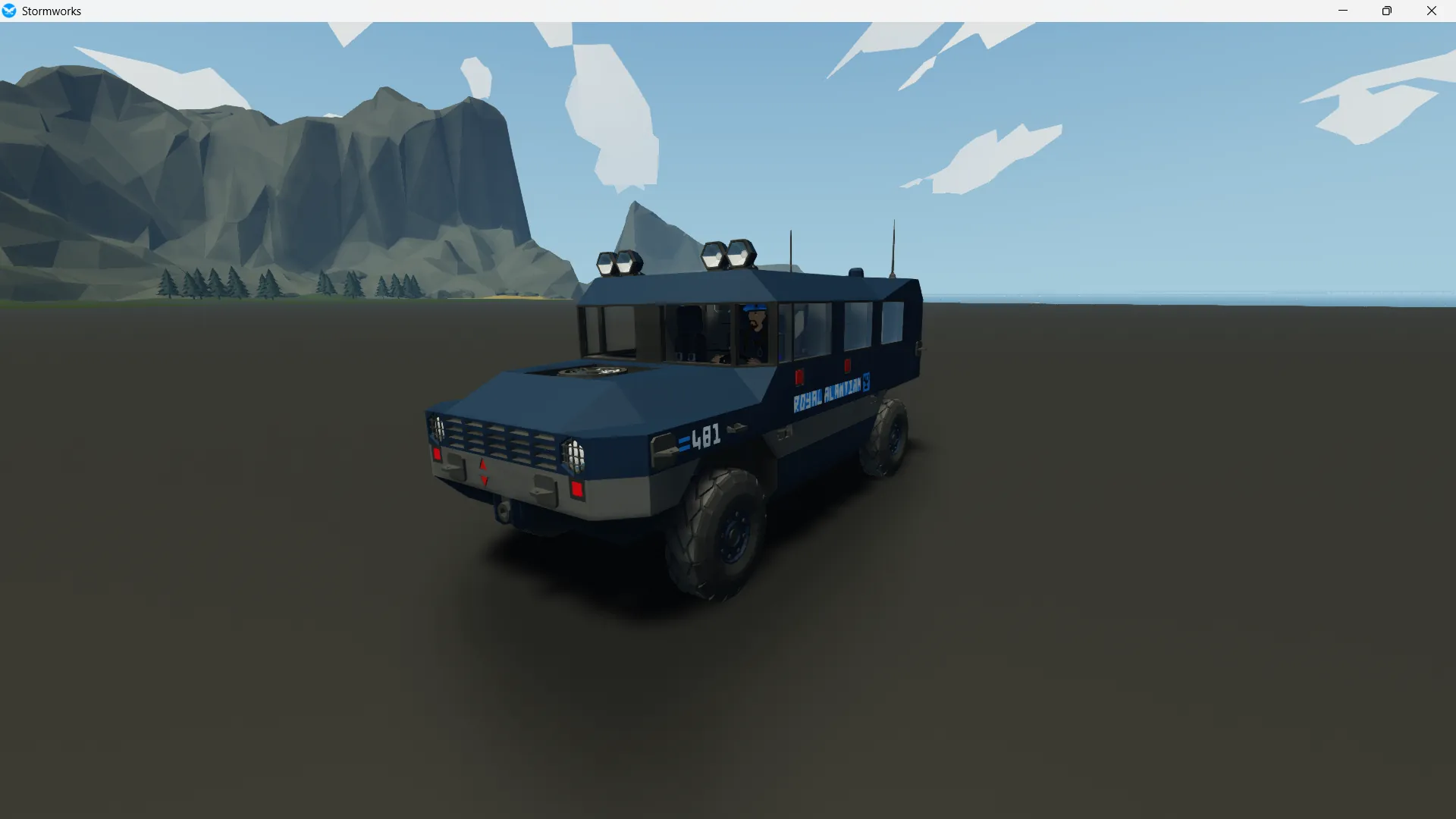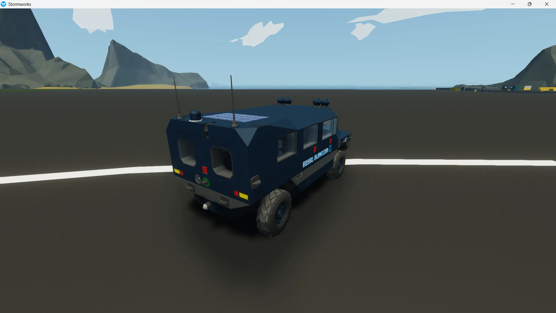 this is a civilian model of my ARC1000 potrol car series and is painted in Royal Alantian Shipping Company colors but feel free to repaint it and post any pics you take on the stormworks community pages. it is built to the mark 2 standard and has all the same features minus the roof turret and IFF beacon