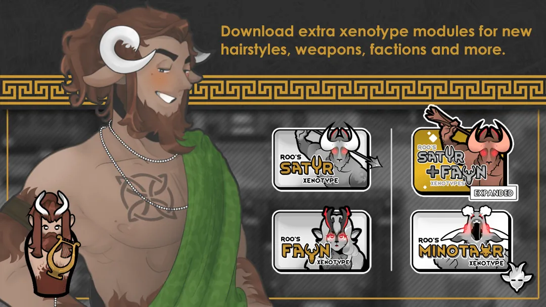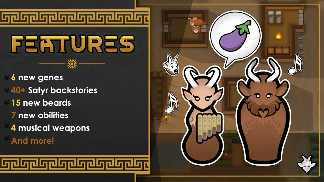 Within the clutches of the forest live the satyrs; a race of goat-like pranksters with a penchant for causing mischief. They’re easily distinguishable from [url=https://steamcommunity.com/sharedfiles/filedetails/?id=2971801826]fauns[/url] by their sharp horns, curly beards, and love of the limelight. Check out what's new in the [url=https://steamcommunity.com/sharedfiles/filedetails/changelog/2971803439]1.5 Change Log[/url].
