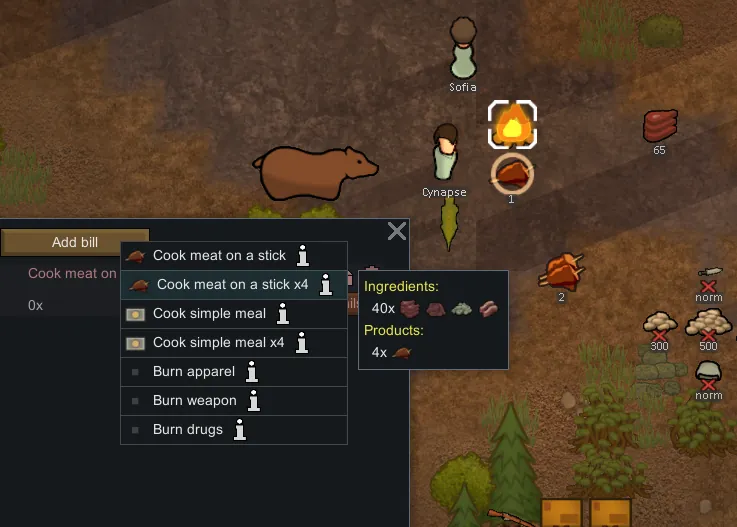 Are your colonists recently crashed into the wilderness and barely surviving on hunted game? Are you unsatisfied with the appearance of simple meals? Does a yellow blob on a grey rectangle seem poorly representative of meat roasted over a fire? No more! Arm yourself against starvation with the latest in neolithic stick-based meat technology, meat on a stick!