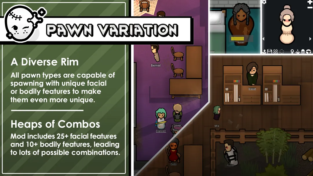 • [url=https://steamcommunity.com/sharedfiles/filedetails/?id=1874644848] Character Editor [/url] – Allows you to customise pawns on the fly, adding or removing blemishes whenever you like.