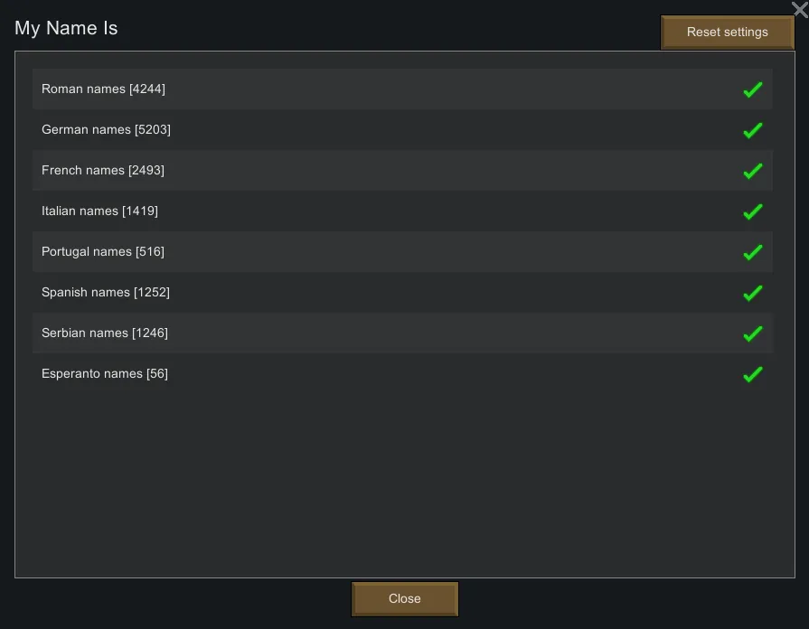 This mod provides the ability to add new names to the game and assign them to certain categories. The name in the game consists of [b]First[/b], [b]Last[/b] and [b]Nick[/b] names. The mod allows you to add names to each of the names.