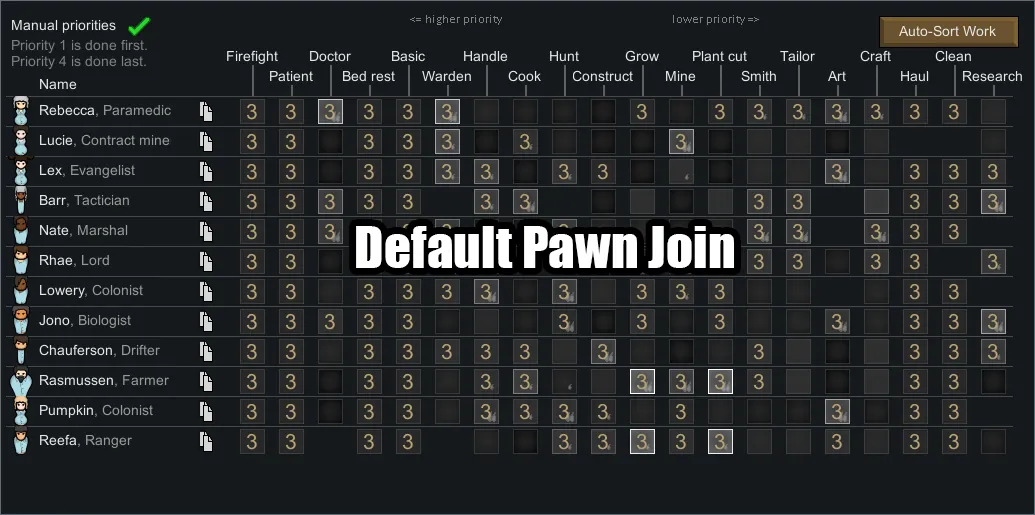 .: A Work Priority set to Auto will default to the No Passion Slider should the pawn not have a Single/Double Passion.
