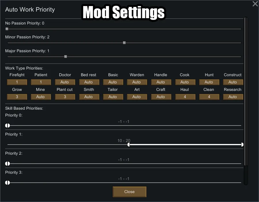 This simple mod adds a mod settings page that can be customised to auto-assign work priorities based on your pawns passions, work types and skill levels.