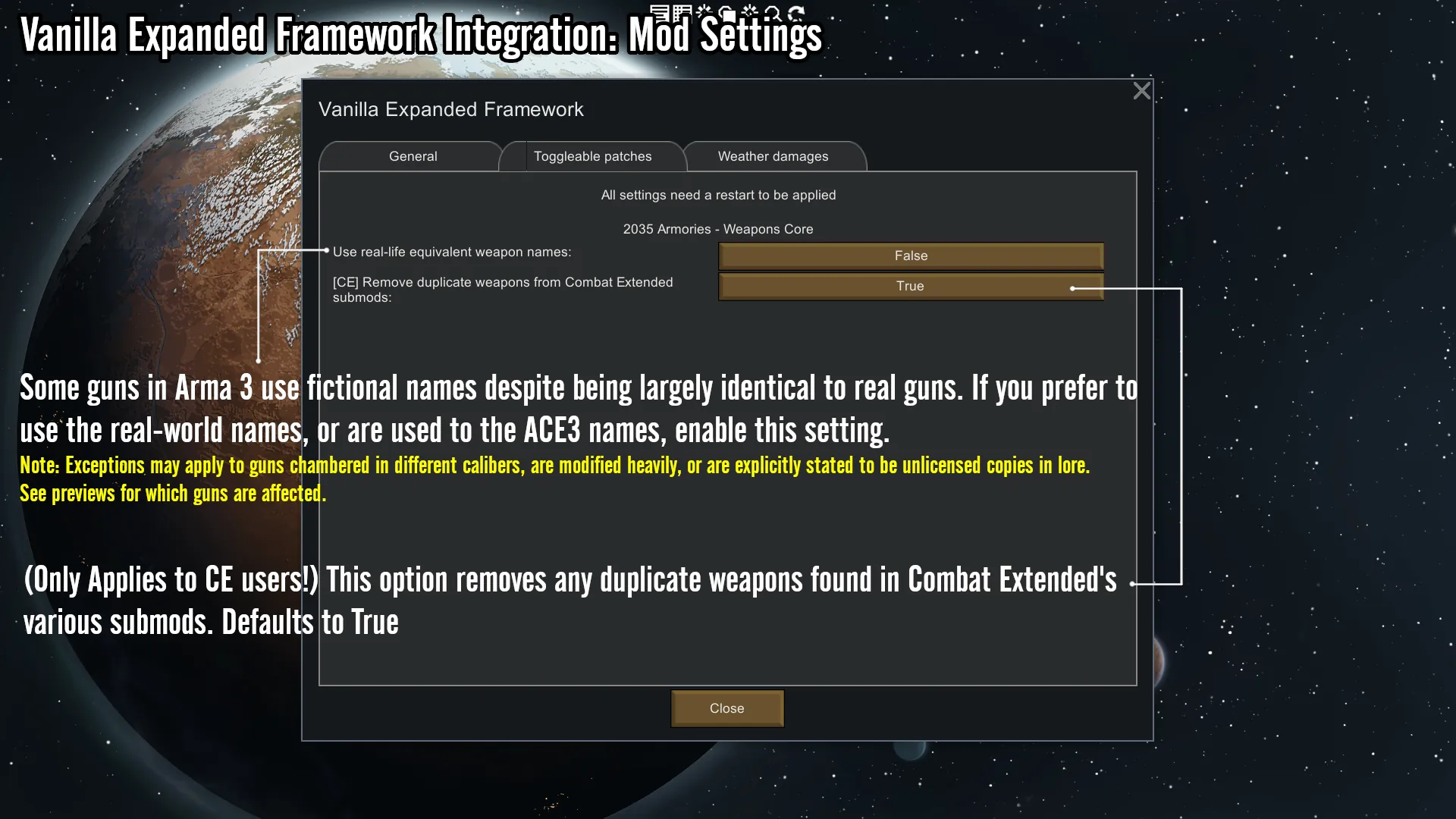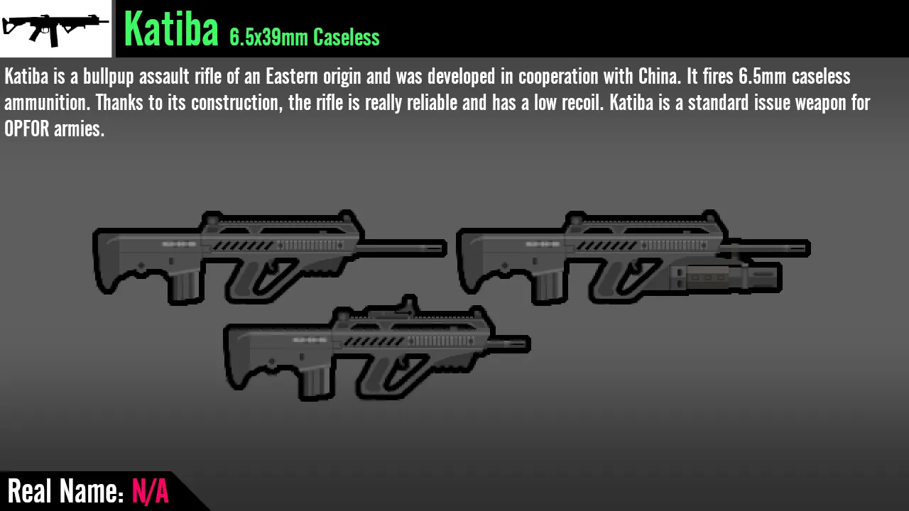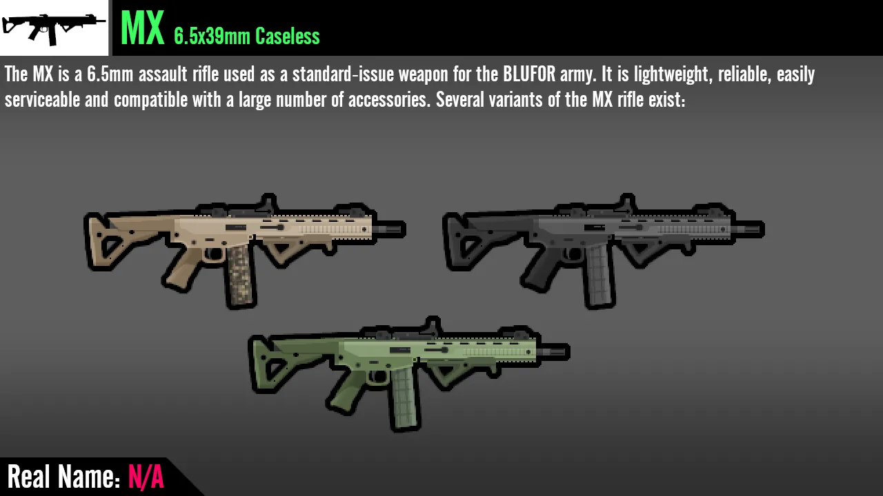 A: Some guns in Arma 3 use fictional names despite being largely identical to real guns. If you prefer to use the real-world names, or are used to the ACE3 names, enable "Use real-life equivalent weapon names:" in the Vanilla Framework Expanded mod settings if you have that mod loaded.
