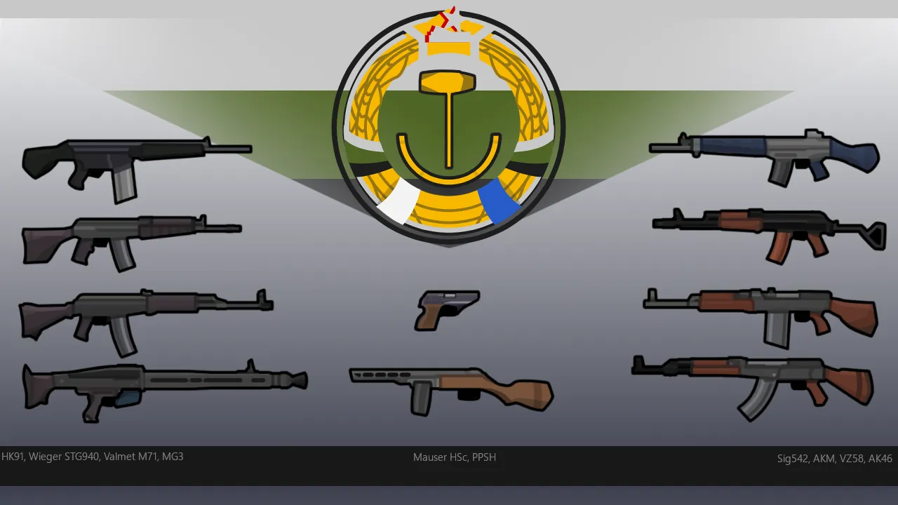 The non East-German guns are there because I didn't want to draw more AKs and had a bunch of unused old textures by the way.
