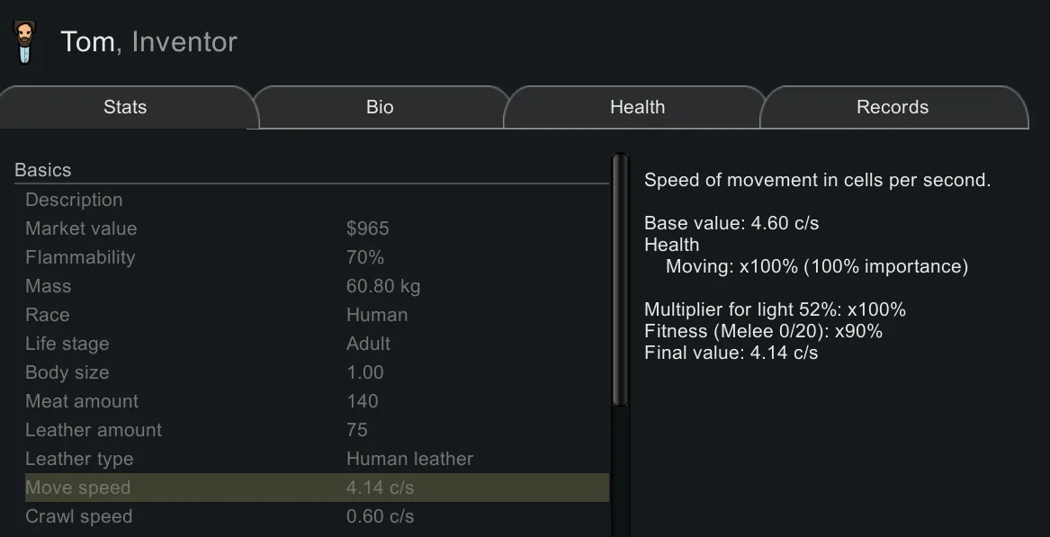 [*] Look at the move speed, carry capacity or general labor speed in the stat card of your pawn