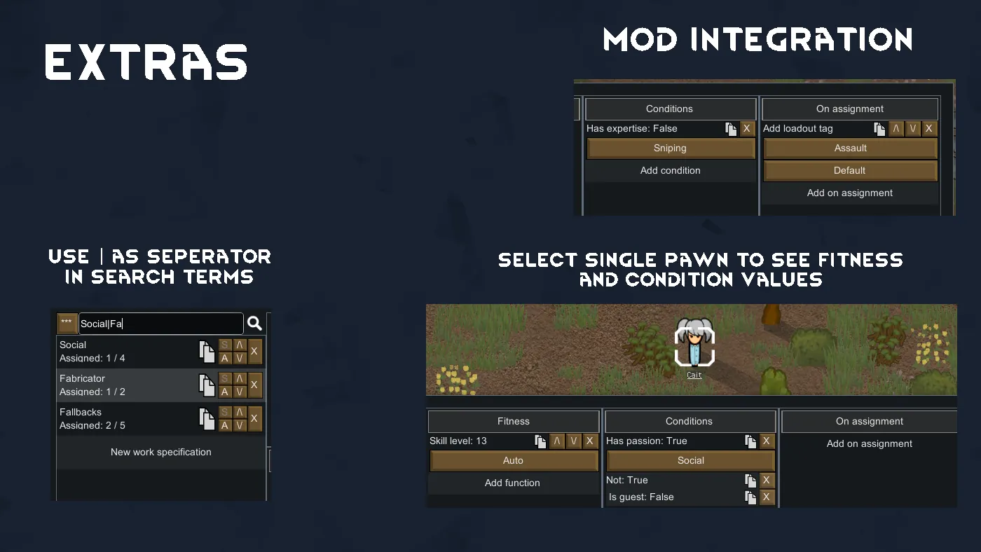 The current library of fitness functions, conditions, and on-assignment tasks are just what I've been able to come up with during development. More can added at request, or if you're feeling up for it, by other mods. The system is designed to be easily extensible. To implement a new fitness function, you just create a new class that implements the IPawnFitness interface, create a PawnSettingDef, and provide a PawnSettingUIHandler object. Check out the source code if you're feeling brave. (Fair warning, it was written largely over a weekend binge, enter at your own risk.)