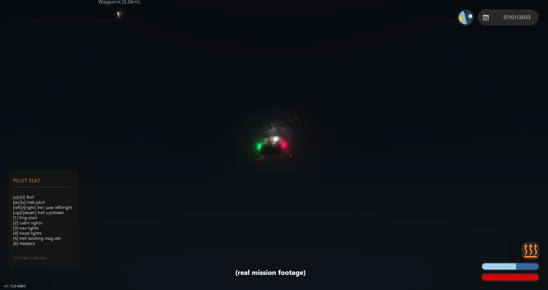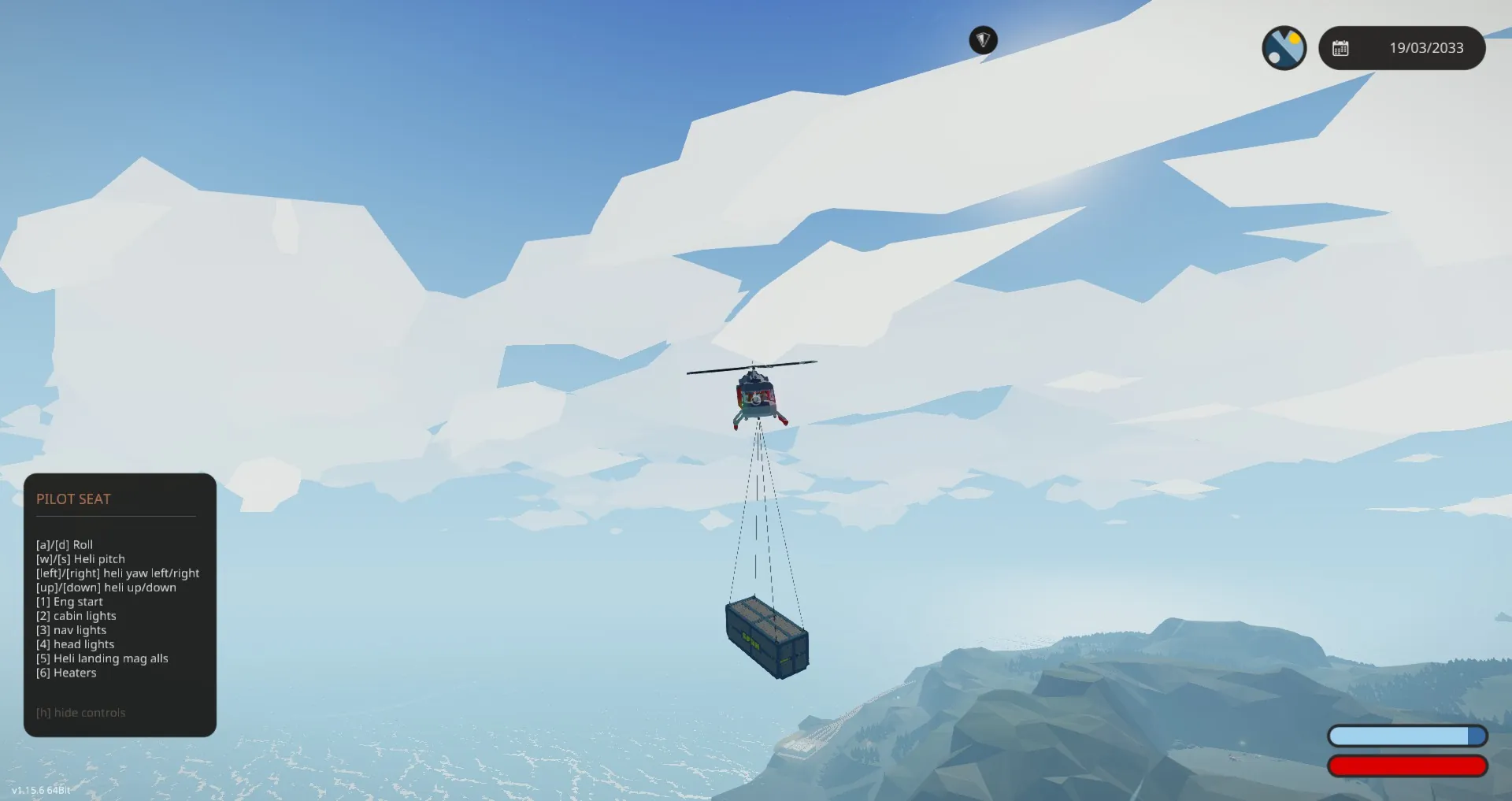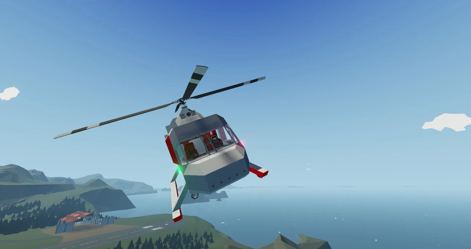 This heli is simple and efftive to transport people and cargo around the world with internal cargo mag alls and rope anchor for lifting with landing mag alls for moving ship landings and uneven terrain landings. The heli has 2050 L of fuel and can go 39 meters per second (when fully pitched down and collective fully up). The heli also has cruise controll by using the trim, set the pitch trim to be 0.79 and the collective trim to be 1, this allows the heli to maintain altitude and move foward without making adjustments.
