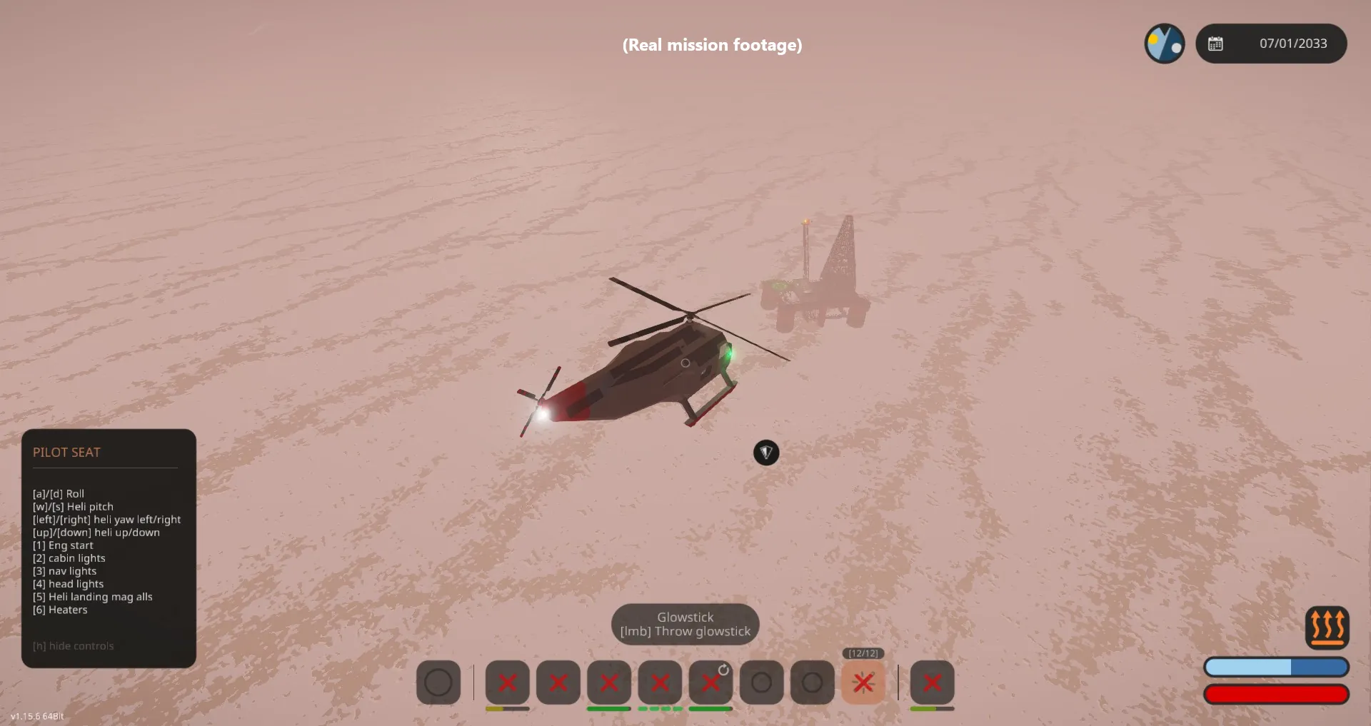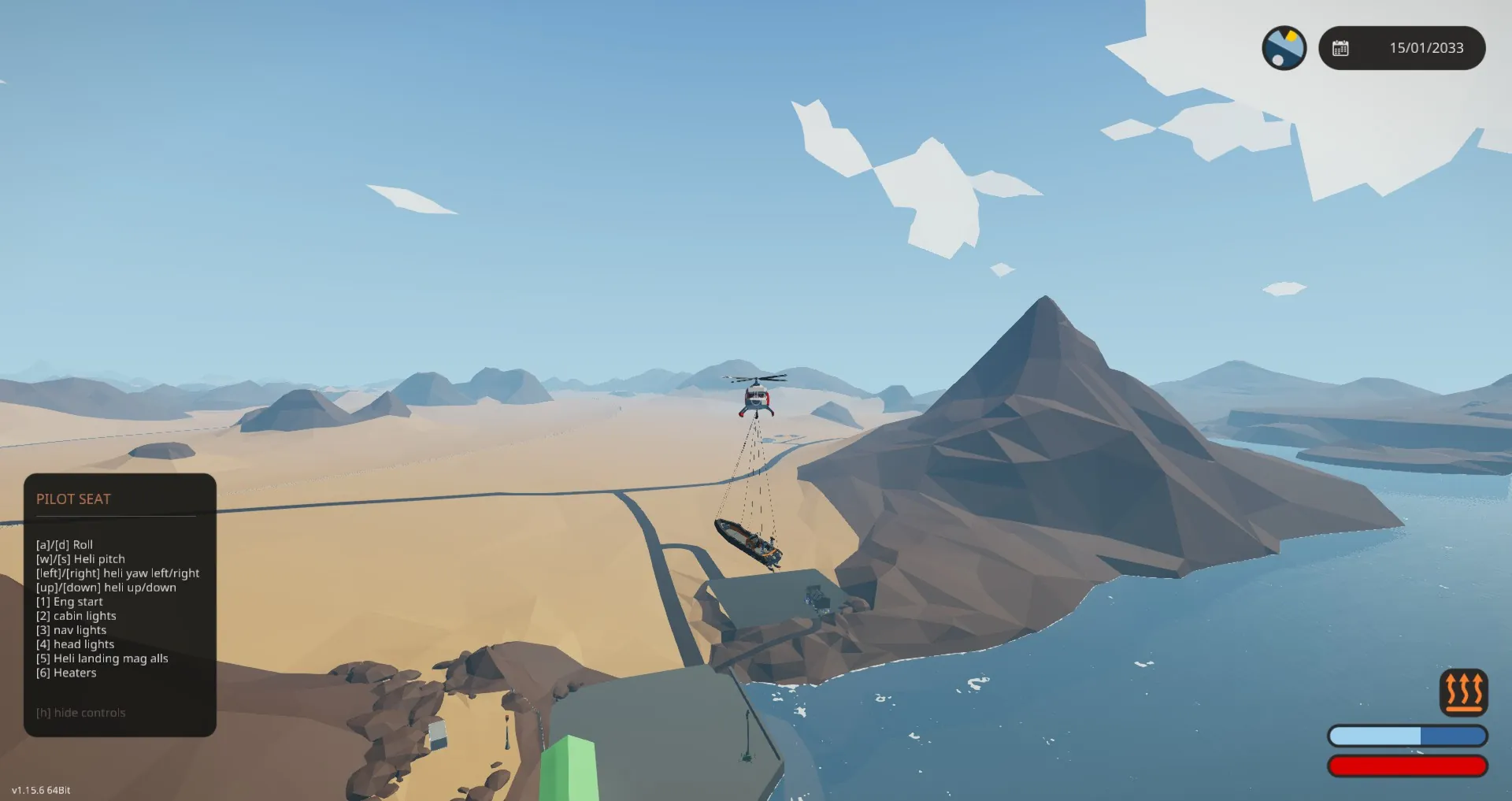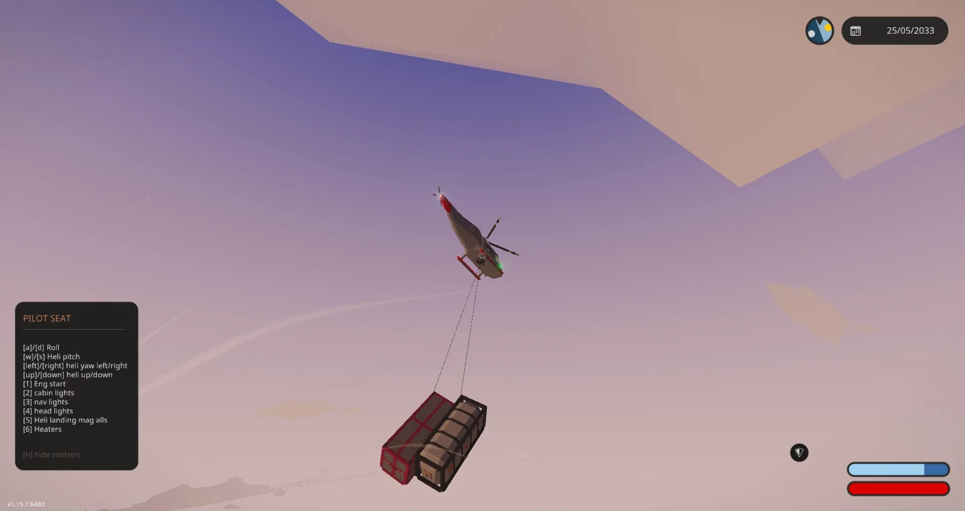 This heli is simple and efftive to transport people and cargo around the world with internal cargo mag alls and rope anchor for lifting with landing mag alls for moving ship landings and uneven terrain landings. The heli has 2050 L of fuel and can go 39 meters per second (when fully pitched down and collective fully up). The heli also has cruise controll by using the trim, set the pitch trim to be 0.79 and the collective trim to be 1, this allows the heli to maintain altitude and move foward without making adjustments.