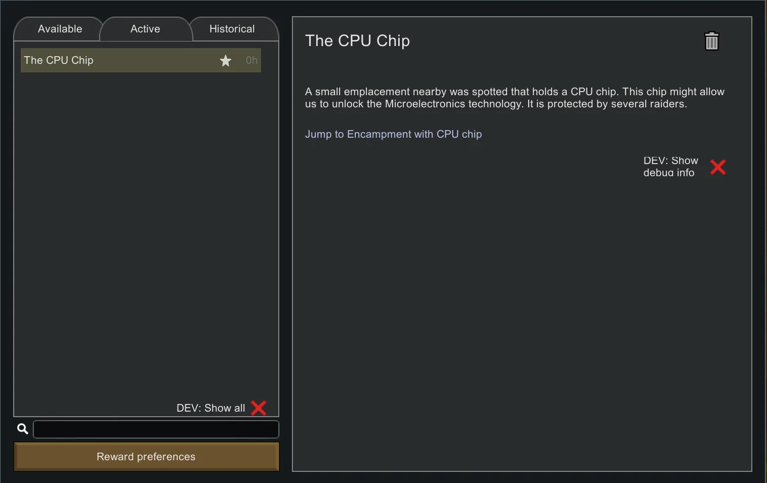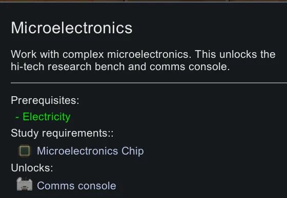 [*] The mod adds a super basic quest at the beginning of the game that does not expire. It spawns an encampment with a Microelectronics chip. You need to study that chip to unlock the Microelectronics research