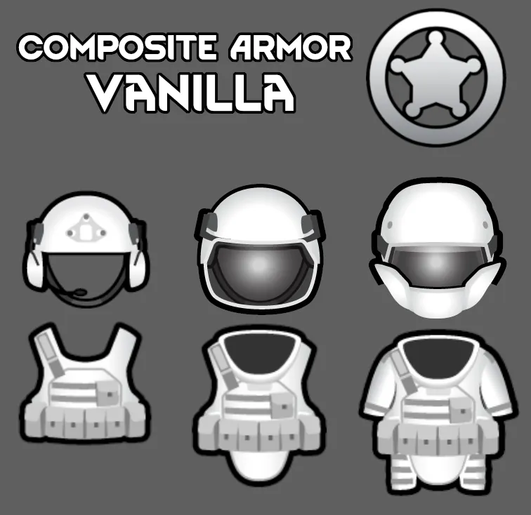 A port of Serina's CE:Armors - Extended Cut, bringing the associated composite armors and equipment, into vanilla gameplay. Composite armor is balanced to be superior to flak armor but no better than power armor. All the associated composite armors and helmets must be researched at a Hi-tech research bench as its own technology and then constructed at a Machining table.