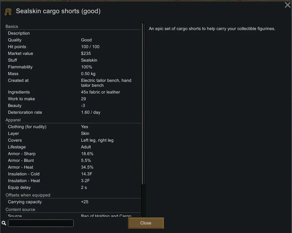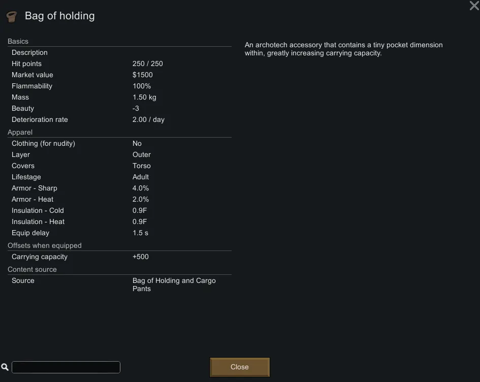 Introduces the legendary Bag of Holding from the hit game Dungeons & Dragons which greatly increases pawn carrying capacity, as well as cargo shorts from your local computer science department which slightly increase pawn carrying capacity.