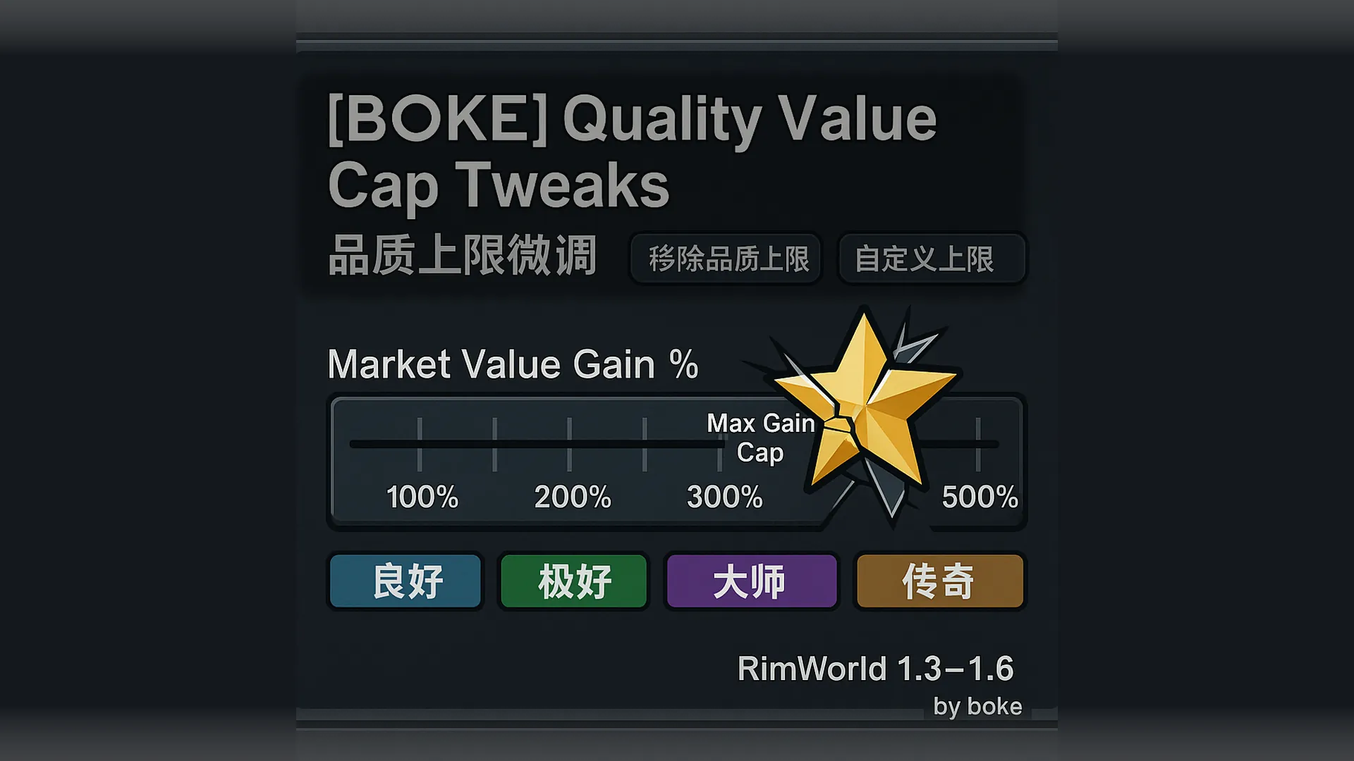 可自定义或移除“品质加成上限”,让物品的市场价值增益不再被原版上限束缚;默认仅作用于带艺术组件的物品,可在设置中改为影响所有带品质的物品。(Customize or remove the quality “Max Gain” cap that limits market value; by default only affects items with CompArt, can be switched to all quality-bearing items.)