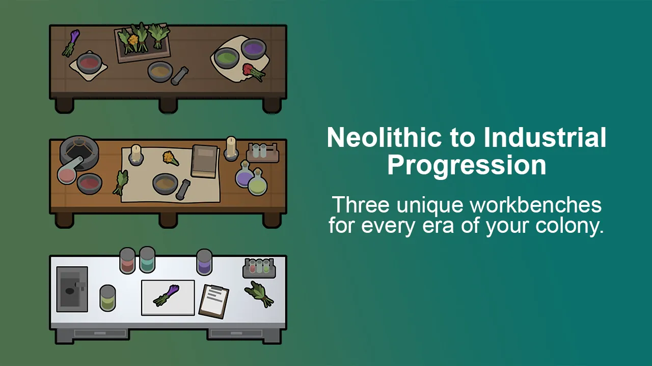 [*] [b]3-Tier Workbench System:[/b] The original Apothecary Table has been replaced with three new workbenches for each stage of the game: from neolithic to industrial.