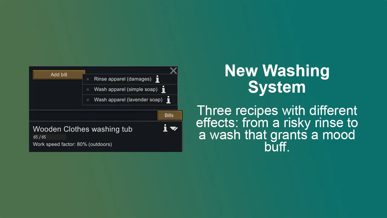 [*] [b]In-depth Washing System:[/b] The old mechanic has been replaced with a new system featuring three recipes. Remove the "Tainted" status from apparel in different ways: from a risky, damaging rinse to a wash with lavender soap that provides a mood buff.