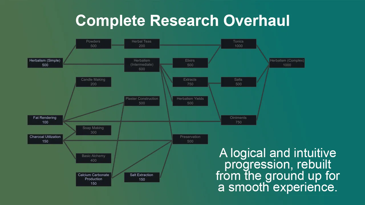 This mod is a complete overhaul of [b]Apothecary (Continued)[/b]. It introduces a new, logical progression system, adds in-depth gameplay mechanics, and provides seamless integration with the vanilla game and Medieval Overhaul.