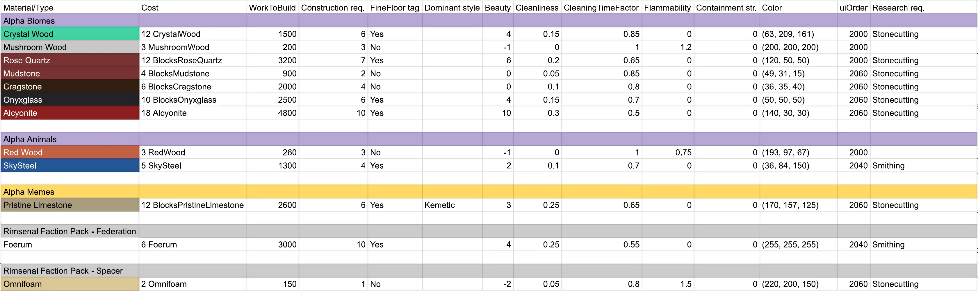 [*] [b]Vanilla[/b] - Wood, Steel, Silver, Gold, Uranium, Plasteel, Sterile, Bioferrite, Sandstone, Granite, Limestone, Slate, Marble, Vacstone, Jade, Obsidian, Carpet.