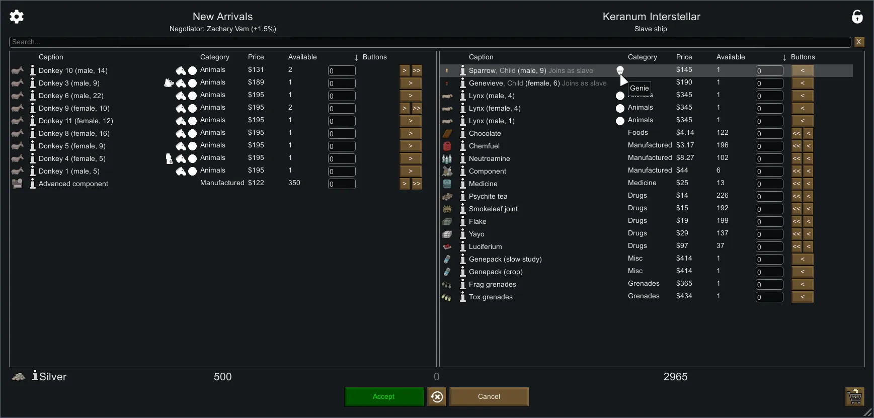 [*] Buy and Sell max affordable using double arrow buttons.