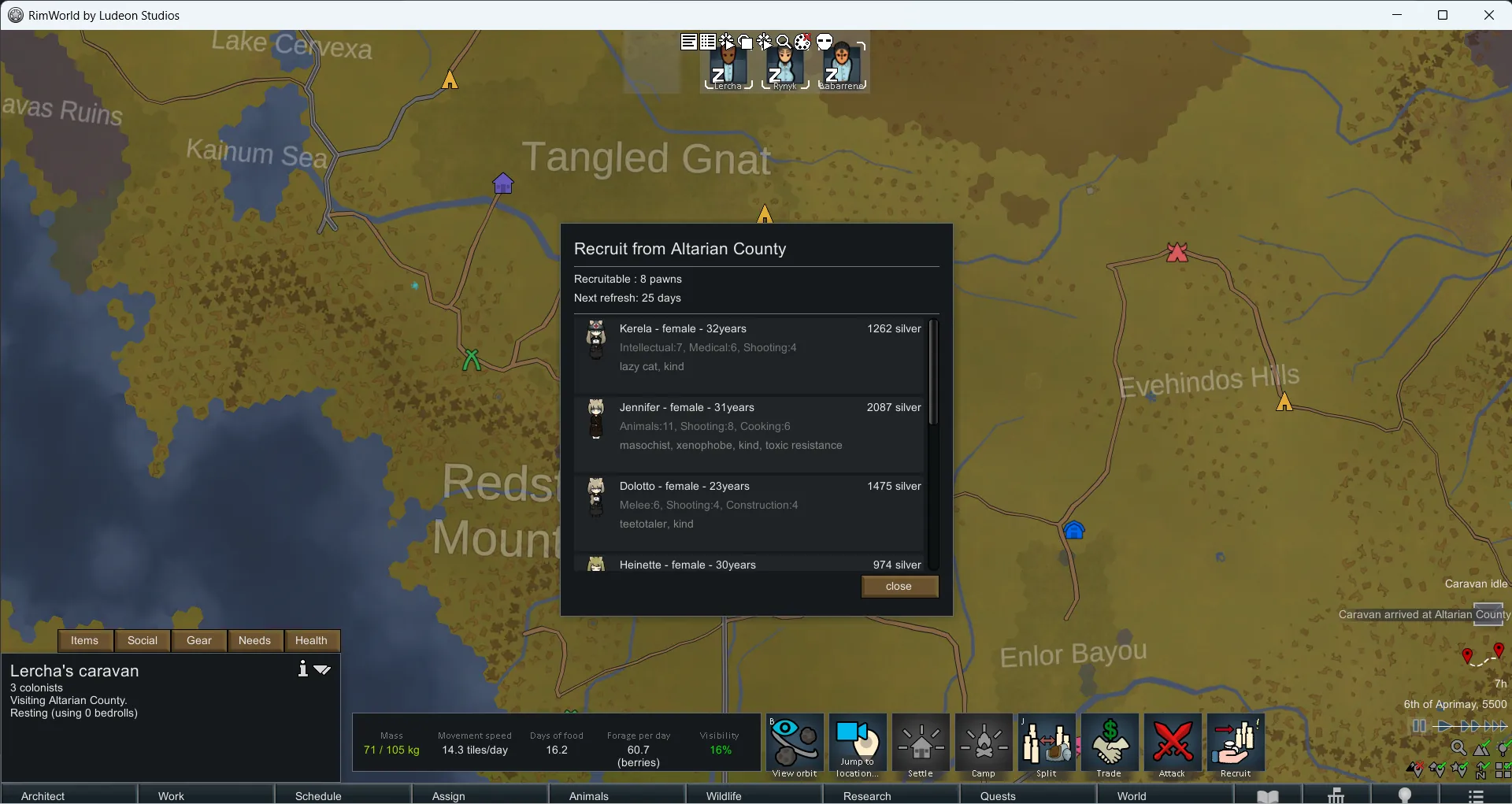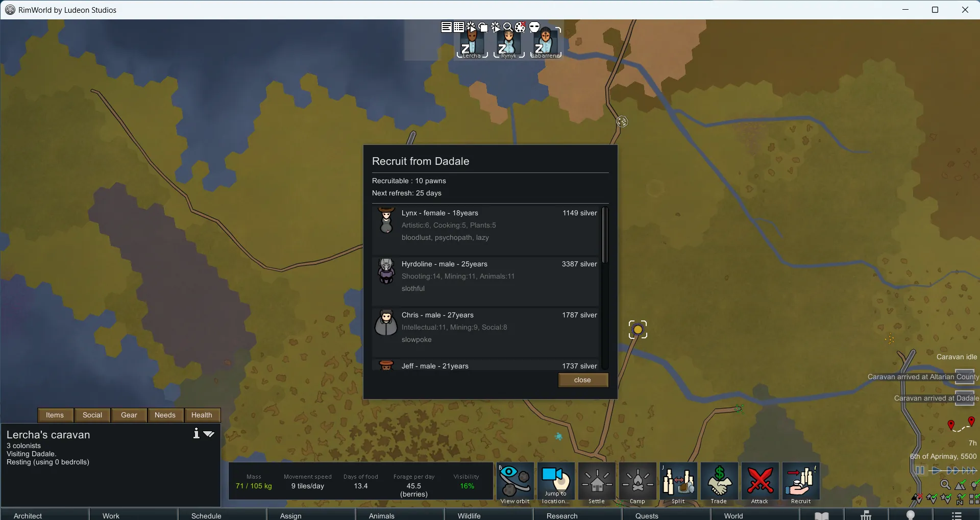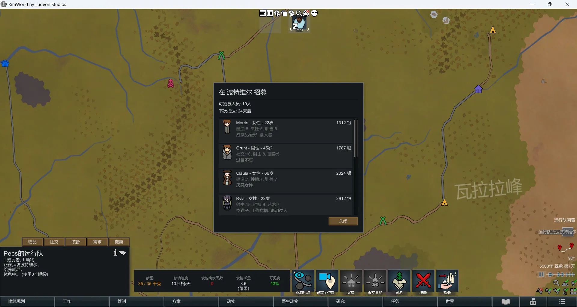Due to the difficulty of population growth in the original colonial management,while the enemies are always endless, and the death and injury of colonizers are always inevitable (can you imagine a colony's main population growth relying on capturing enemies and surrendering?), so I made this mod. It has added a "recruitment" interface to the settlements of various factions, allowing players' caravan to spend silver directly to recruit corresponding faction colonizers from the settlements. It is similar to purchasing colonizers directly from slave merchants or mercenary groups, but it is simpler and more controllable.