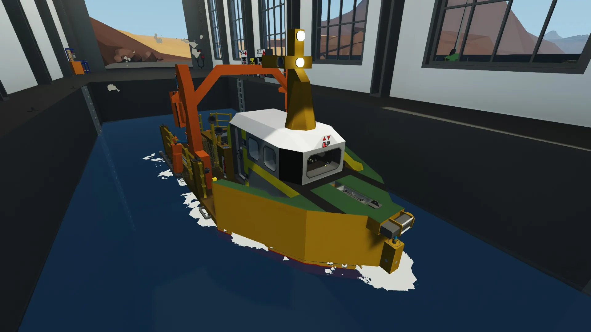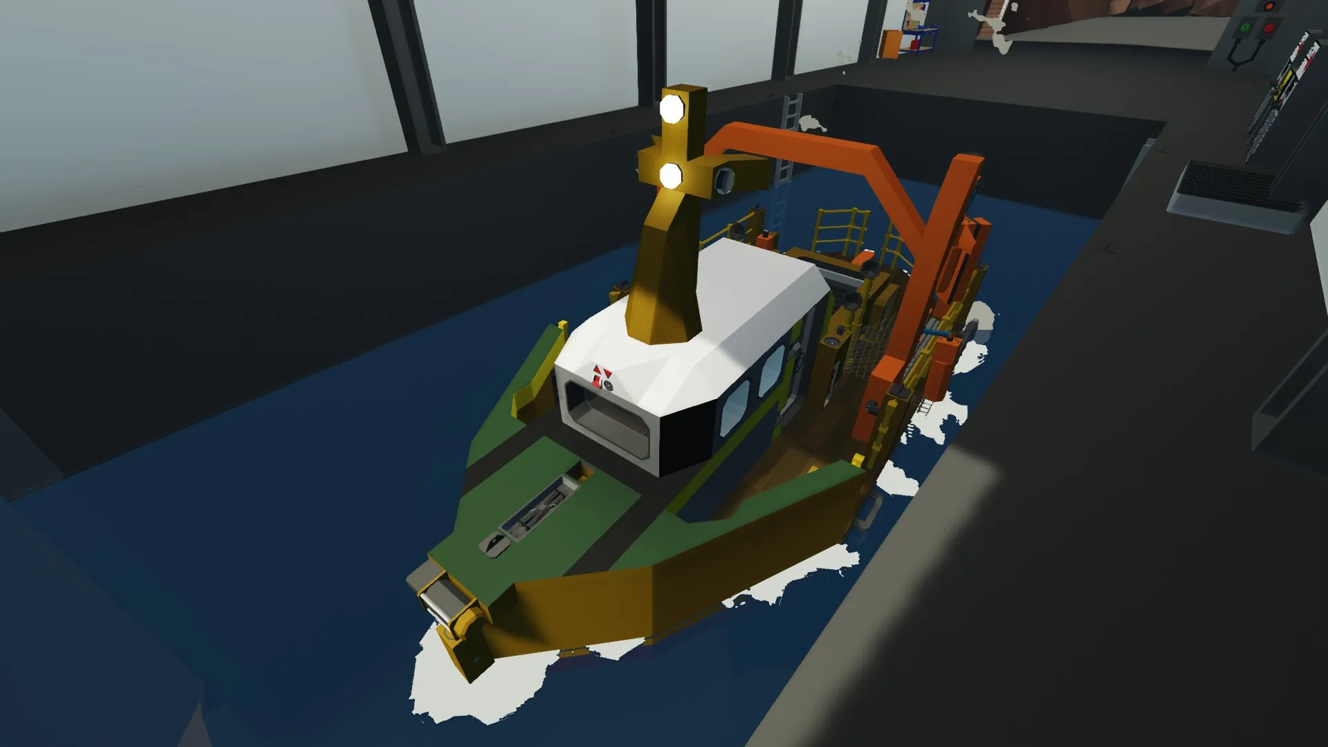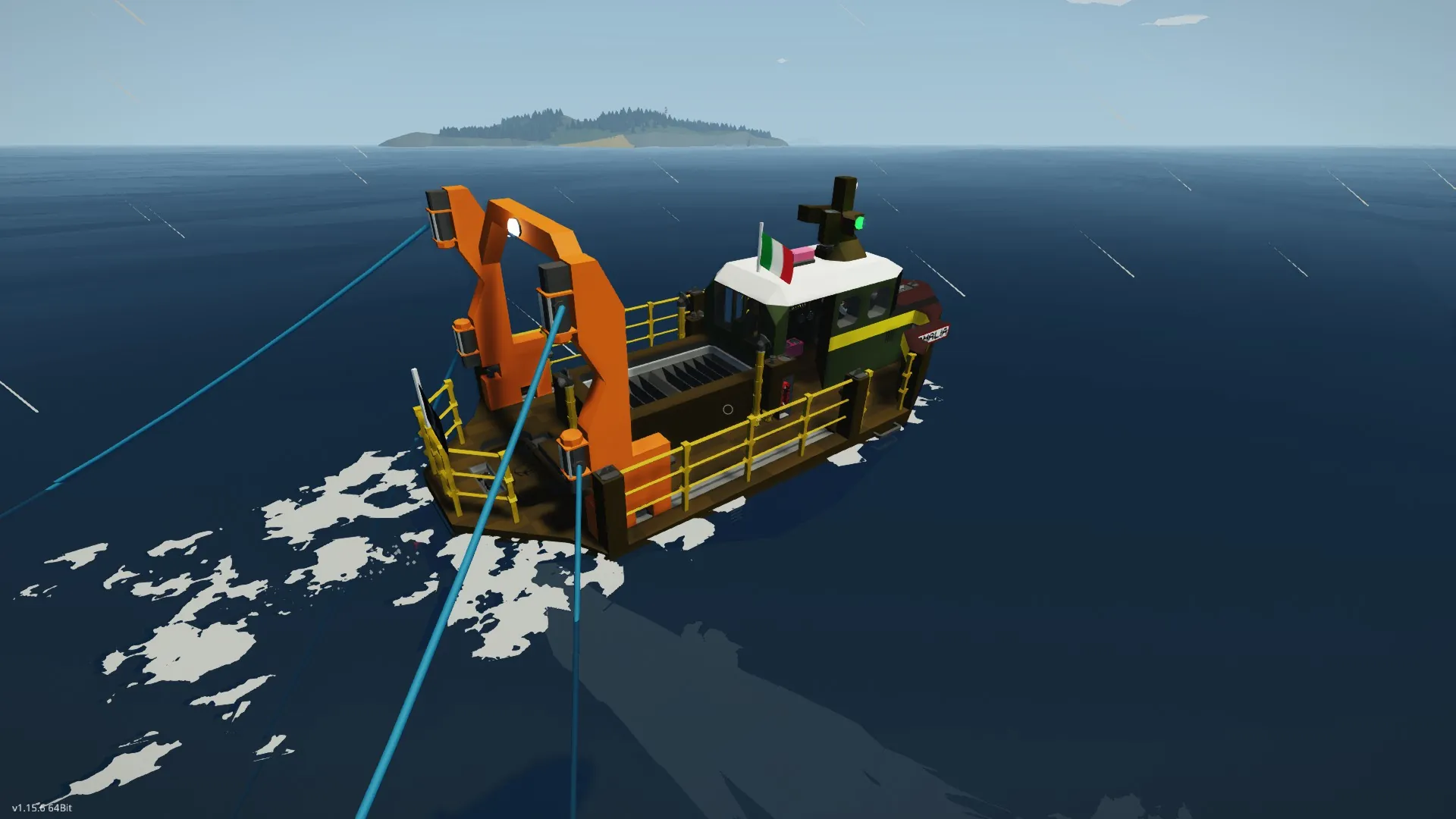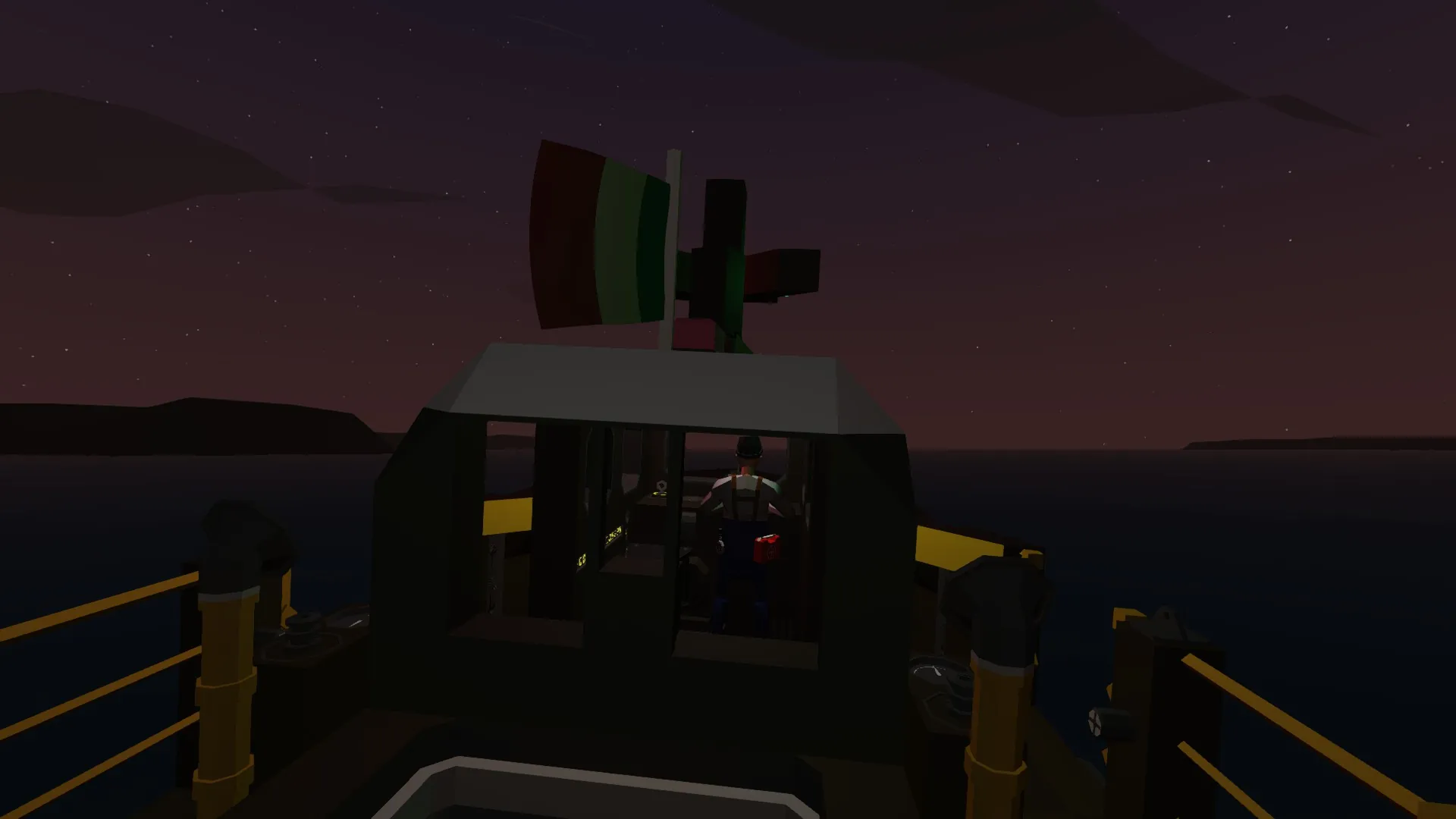 - Switch on the engines with the key at the left of the helm