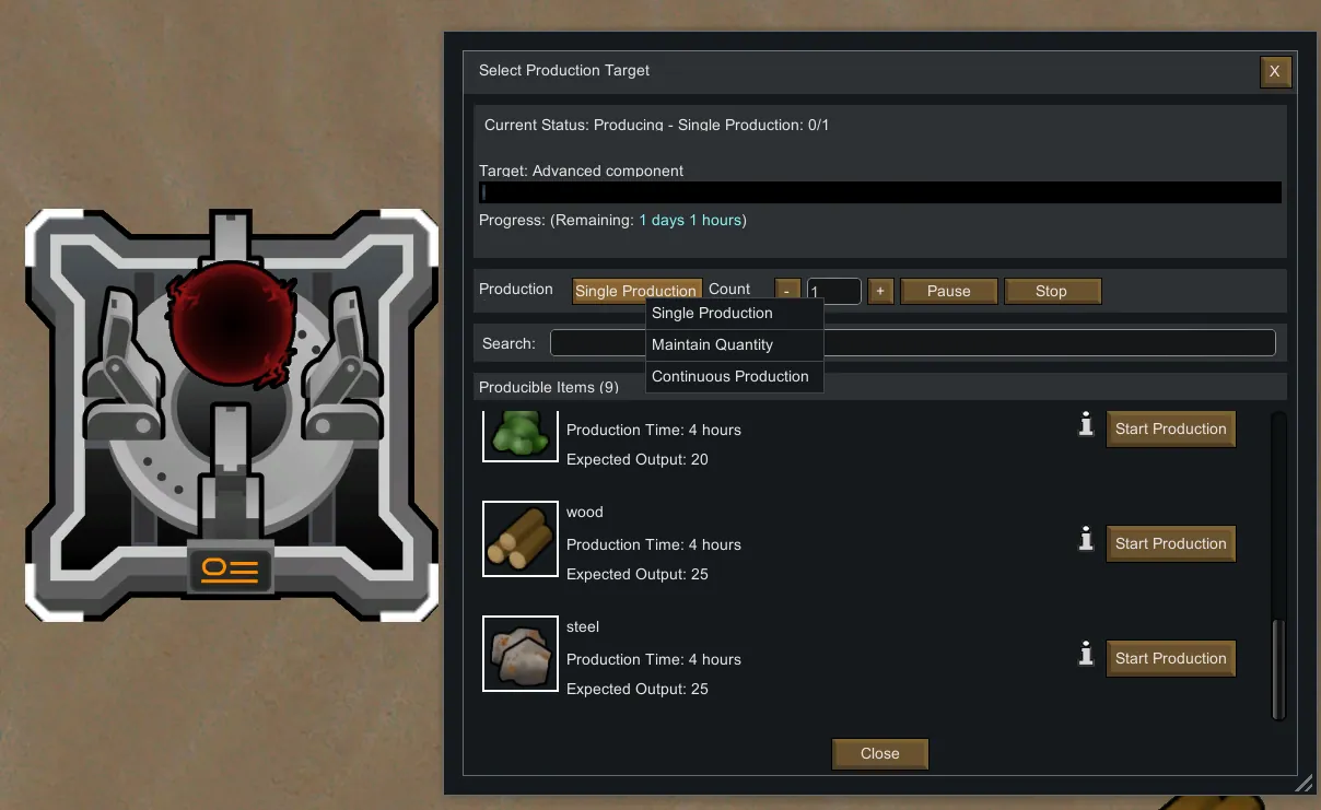 - Operation Logic: Similar to a workbench; requires manual selection and setup of production recipes