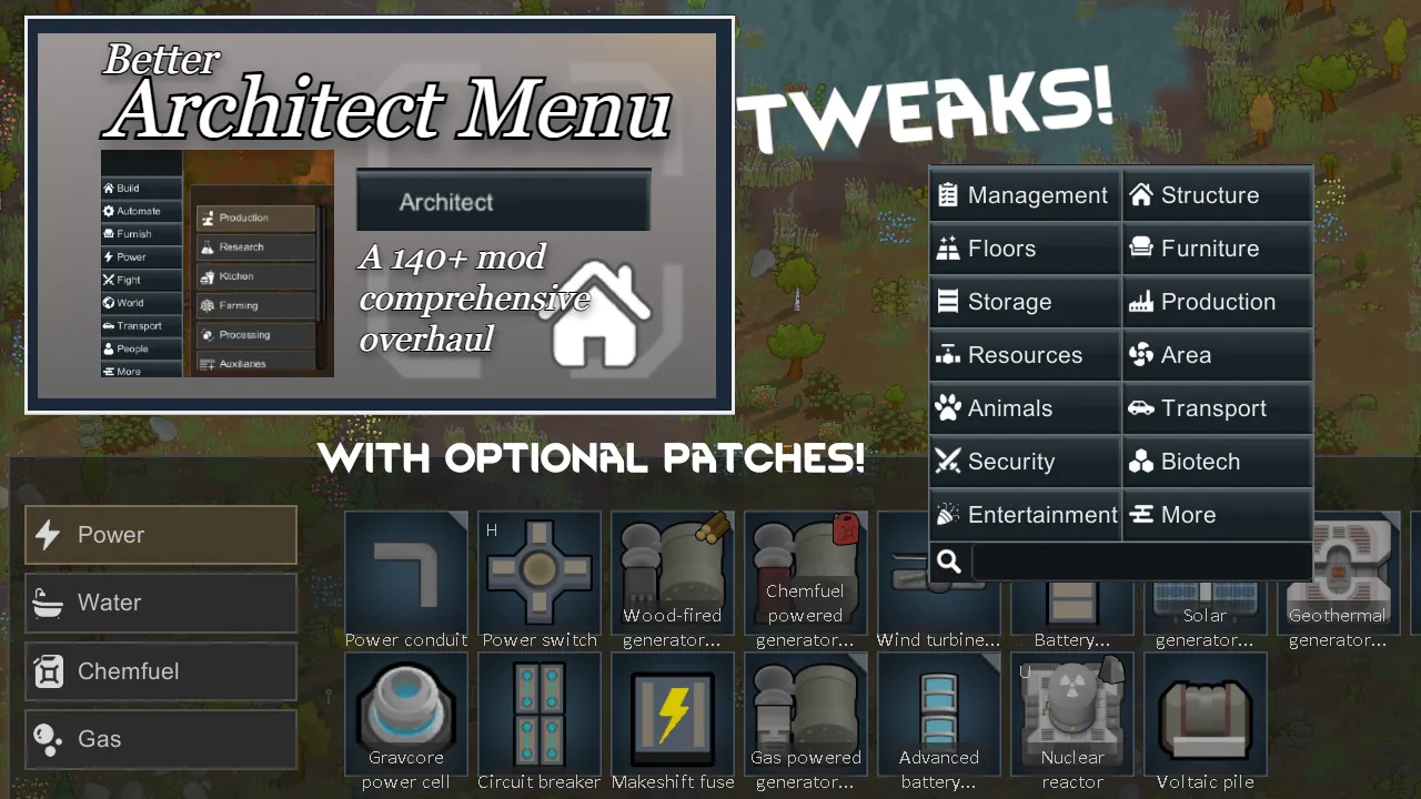 A series of tweaks to Ferny's [url=https://steamcommunity.com/workshop/filedetails/?id=3563882422]Better Architect Menu[/url], condensing categories, renaming categories to all be nouns, decluttering the Water (Dubs Hygiene) category, and more!