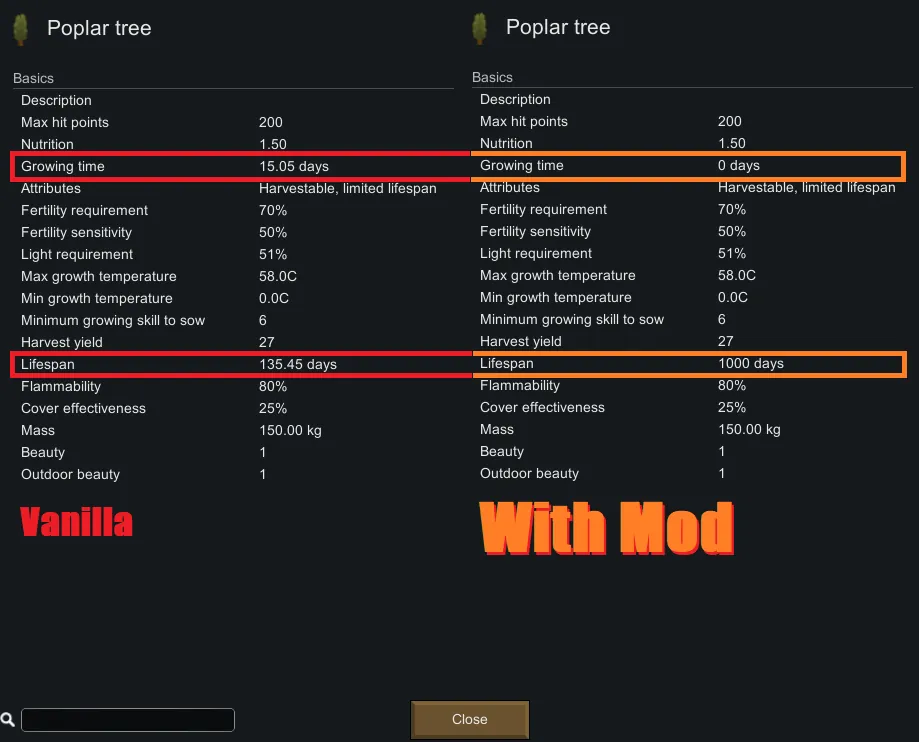 This mod makes all plants grow extremely fast and extends their lifespan dramatically.