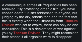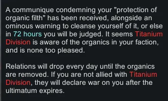 [*] The faction will be permanently hostile to players as long as they have organics. If the player is inorganic but later acquires organic colonists, slaves, or animals (NOT prisoners), the faction will deliver an ultimatum demanding their removal. Failure to comply will result in war.