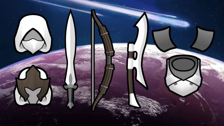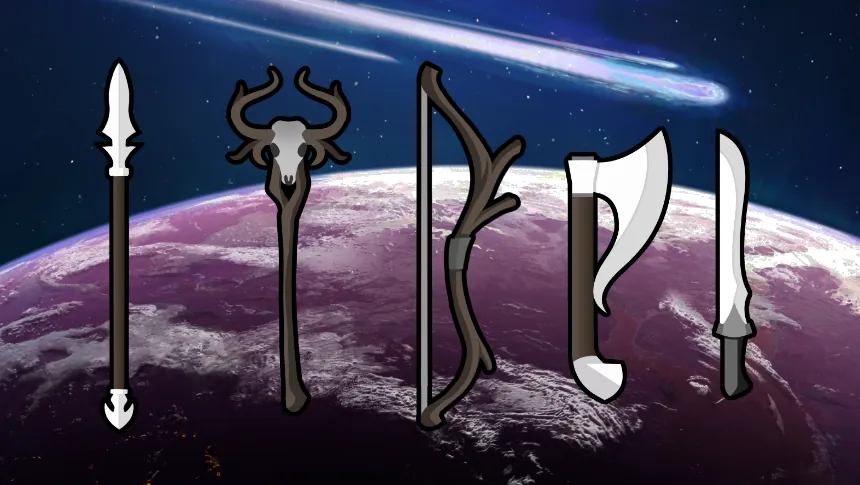 - Spear, Sword, Greatsword, Staff, Shield, Longbow, Greatbow, Recurve bow, Axe, Greataxe