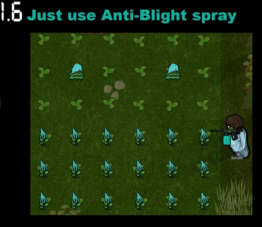 • If blight appears on a protected plant and its severity is still ≤ 0.21 (1% above the spawn value), the infection is instantly removed.