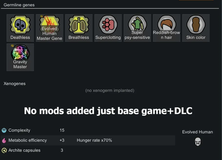 [b]---Adds Evolved Human XenoType , a custom xenotype i made in character editor that i wanted to translate to a mod Basicly think of a sanguophage without the negatives , hemogen need or need for DeathRest.
