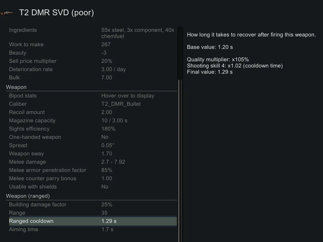 [*] This mod allows you to modify how much the shooting skill affects the cooldown (time between bursts) in [b]Combat Extended[/b]