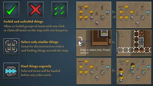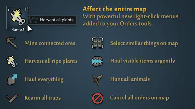 Easily forbid and unforbid items, select similar things, have things hauled urgently and affect the entire map with powerful new tool extensions.