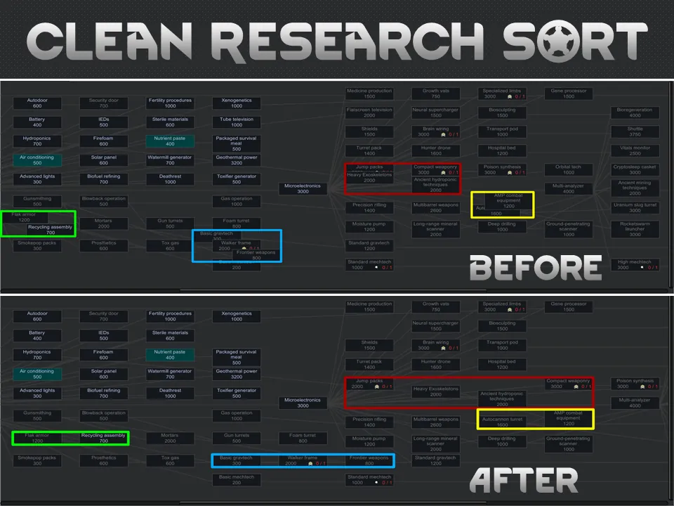 [b]A simple, lightweight mod to auto sort your research projects. It fixes overlapping layouts, so you can easily see what's that. Works with all research—even those from other mods—all while maintaining the game's vanilla aesthetic.[/b]