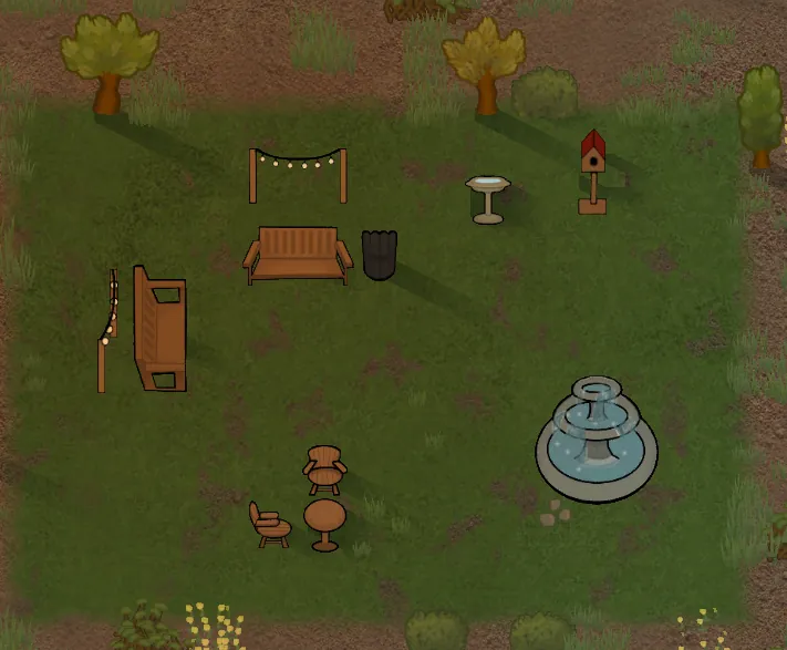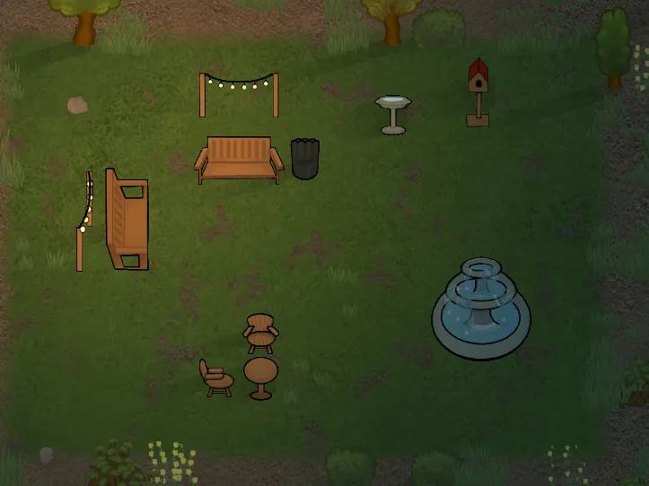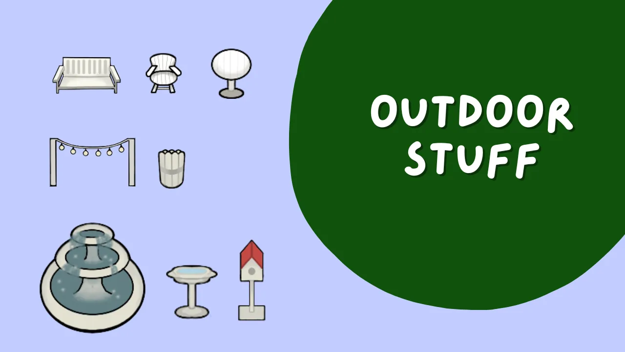 Adds a small amount of outdoor furniture, with a mixture of decorations and functional, including: