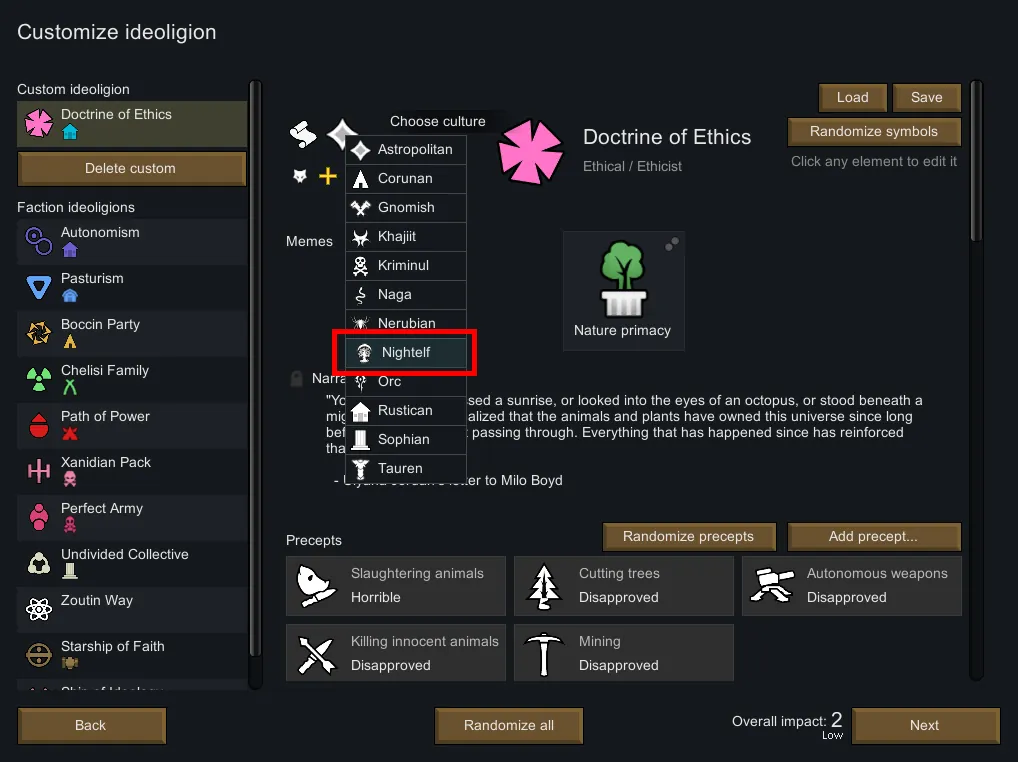 Due to predefined backer pawns, you might still see names like "Trevor Cobb". There's nothing I can personally do, as I have no coding experience to patch those names out from pawn generation when the Night Elf culture is used. However, there's about 10000 possible name combinations with this mod, so there'll be plenty of names for the game to take from. Using [url=https://steamcommunity.com/sharedfiles/filedetails/?id=3548290568]Pawn Name Variety[/url] will eliminate all of these predefined back pawns, and will leave your Night Elf culture with no Trevor Cobbs (No Trevor Cobbs harmed in this process)!