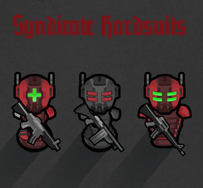 本模组内三套护甲均来源于SS13本体内容,是游戏内主要反派势力辛迪加集团的制式装备,其性能优异常常在PVP对局中大放异彩,血红动力服是最经典的形象。