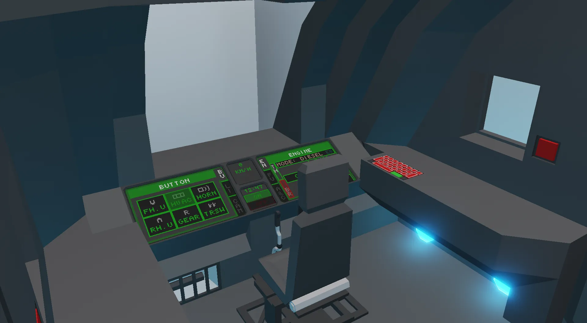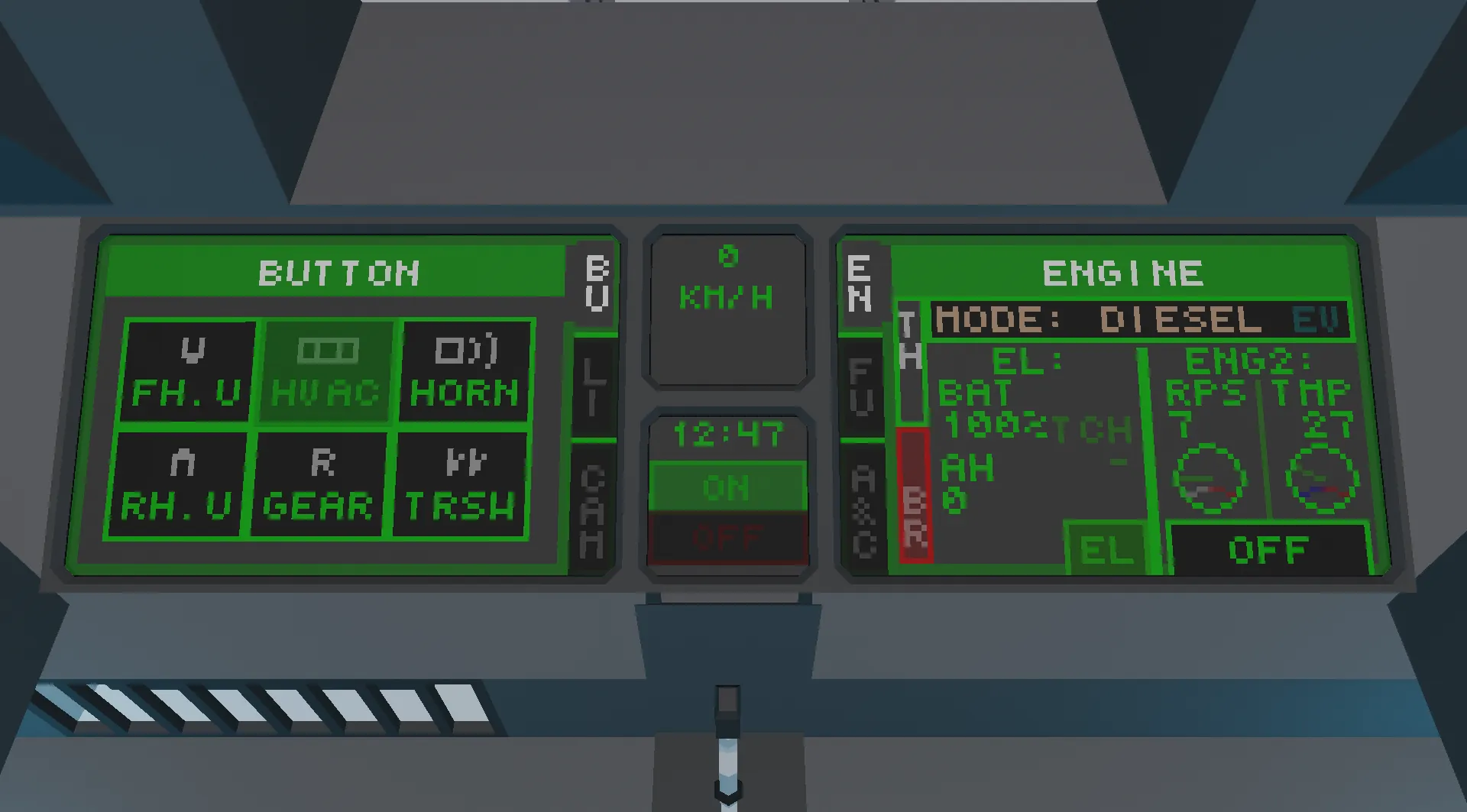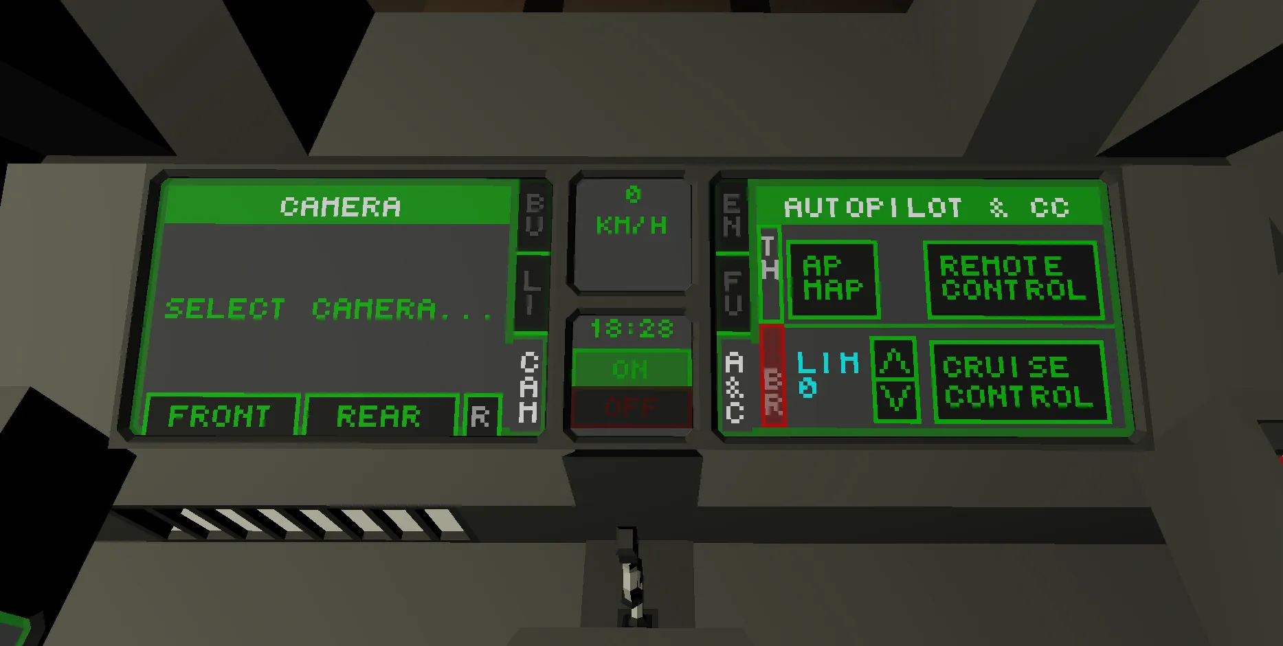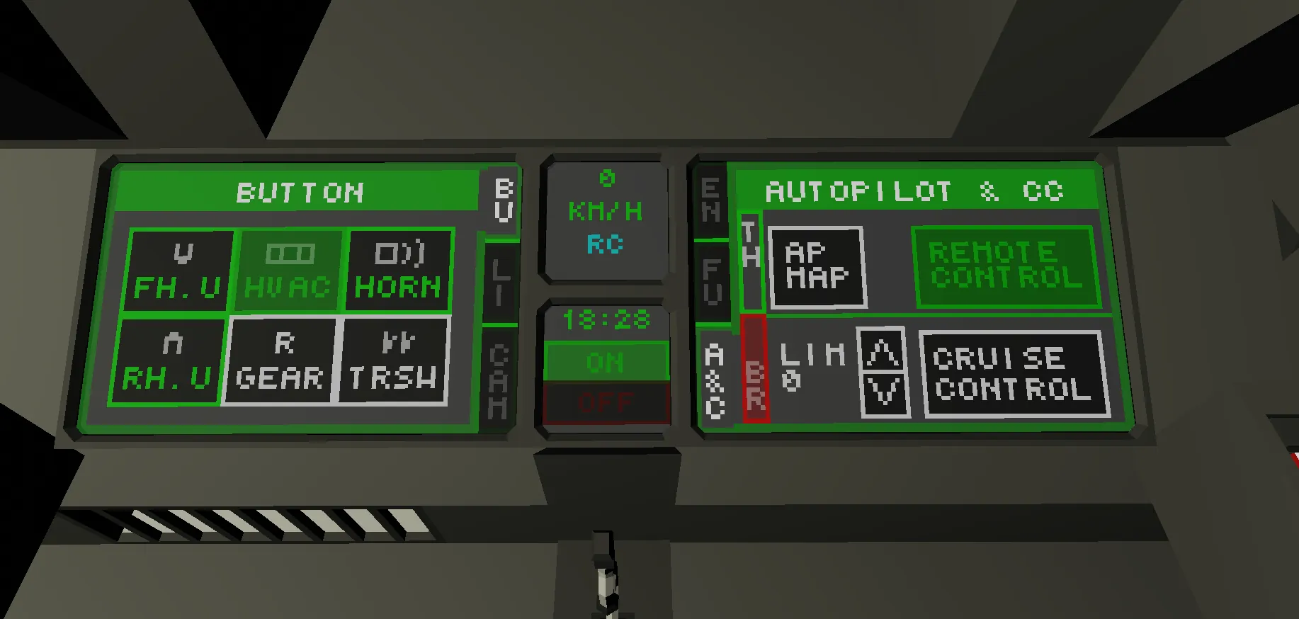 - Remote control using the Lead locomotive. Any number of Follower locomotives can be located anywhere in the train. Follower mode is activated using the "Remote Control" button on the "Autopilot & CC" page. Locomotive control is blocked. Only the following functions are possible: turning on/off the power units, changing the power units, turning on the cab light, checking the battery charge for travel, coupling/uncoupling the front/rear coupling, turning on/off the cab and interior heating/cooling, and viewing the cameras. When remote control is activated, the corresponding front/rear exterior lights illuminate, and the phrase "RC" appears on the center of the overhead monitor.