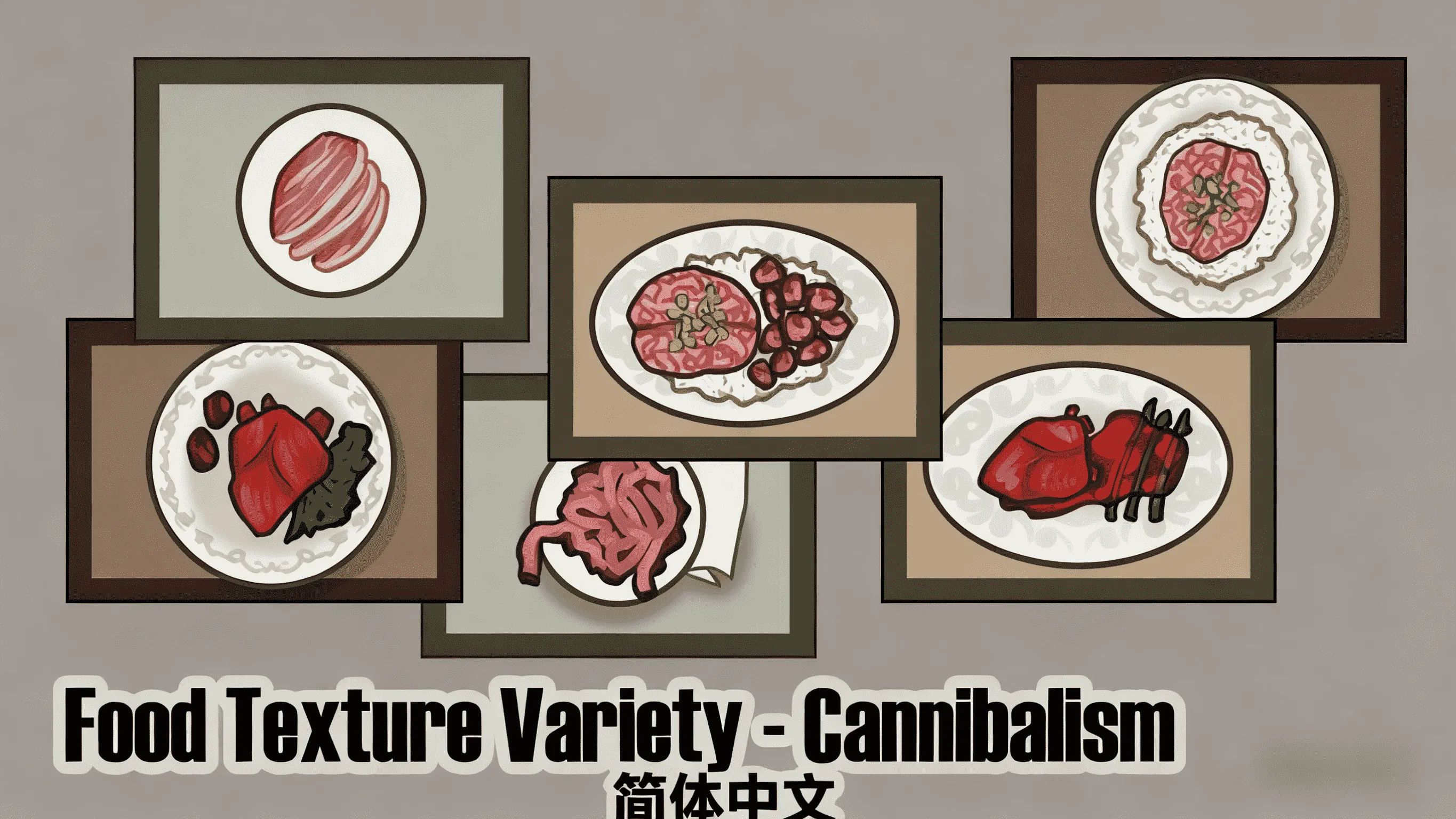 你的殖民者是否厌倦了日复一日地吃同样无法辨认的圆形食物?你是否渴望在他们的饭菜中有一些多样性,而不需要对十几种不同的食谱进行微观管理,这些食谱需要一堆不同的食材?你在经营一个食人族聚居地吗? 这个模组只使用一种食谱,用不同的纹理做饭!添加食人族特有的食谱以复制基础游戏餐,但使用Food Texture variety Core中的品种图形类除外.