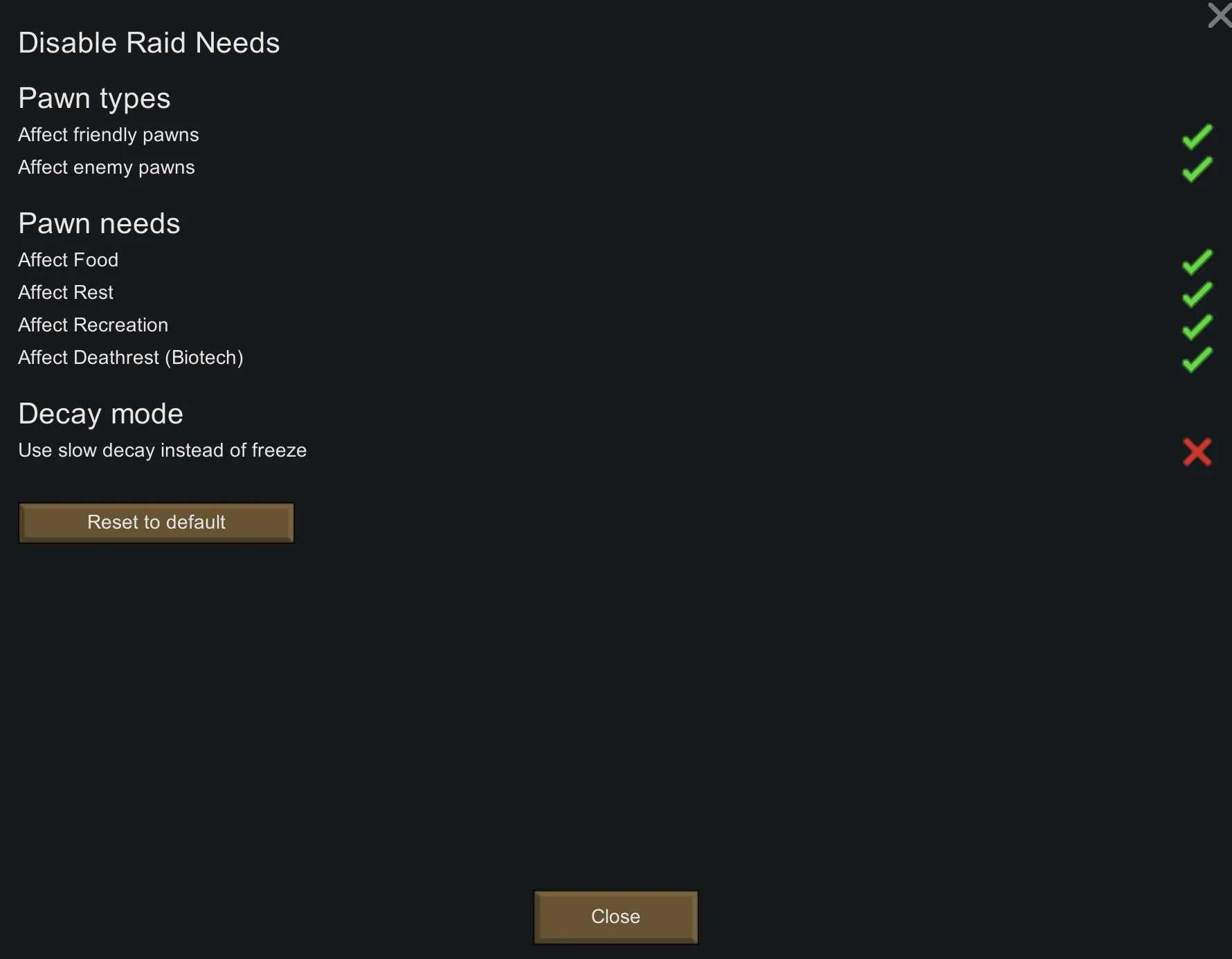 It's very simple too - it checks for raids with hostile pawns. During the raid the needs for all relevant pawns are stored and freezed, but still allow them to increase (for example from eating). Then it returns to normal when there's no hostile pawns on map, enemies are fleeing or they're downed, so basically when the raid is over.